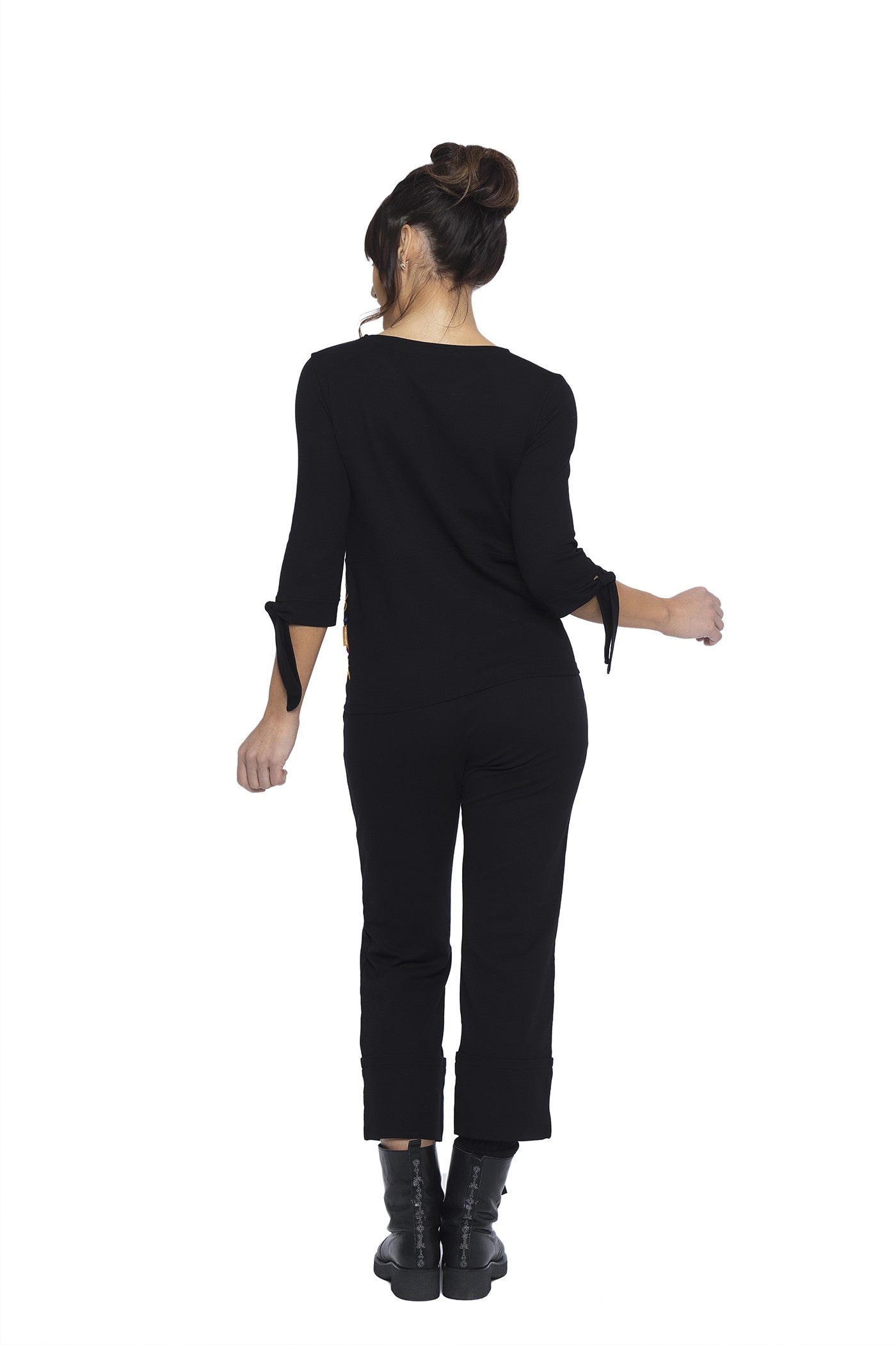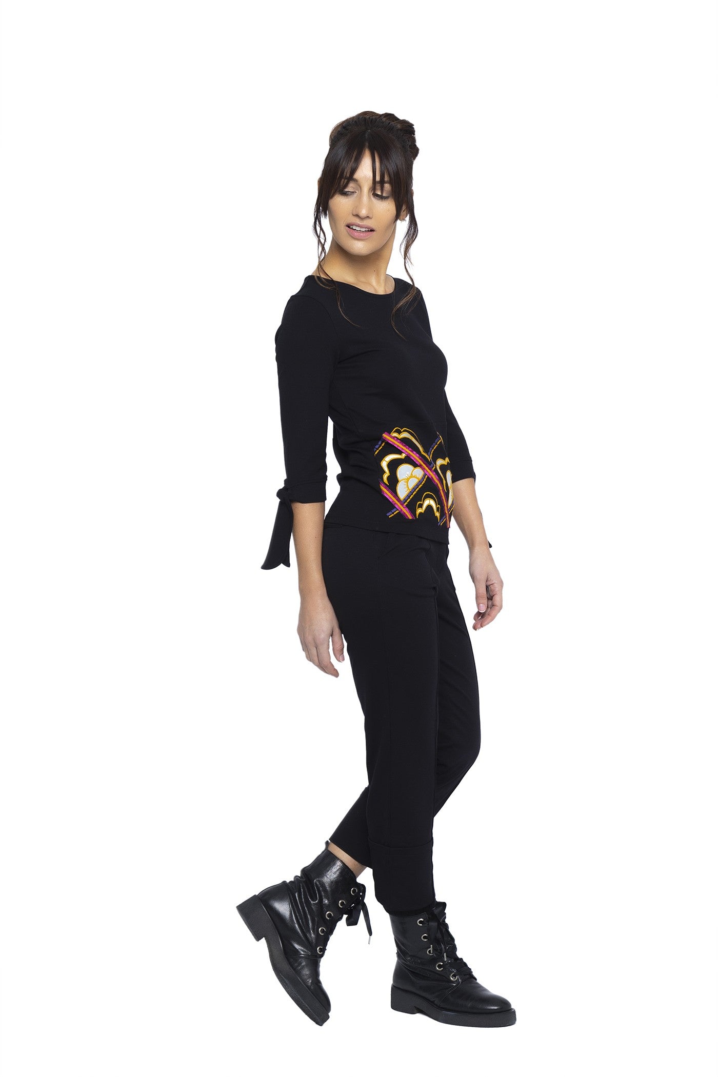 Schwarzes T-Shirt mit farbigen Applikationen auf der Vorderseite, französische Ärmel mit Schleife oben, Rundhalsausschnitt