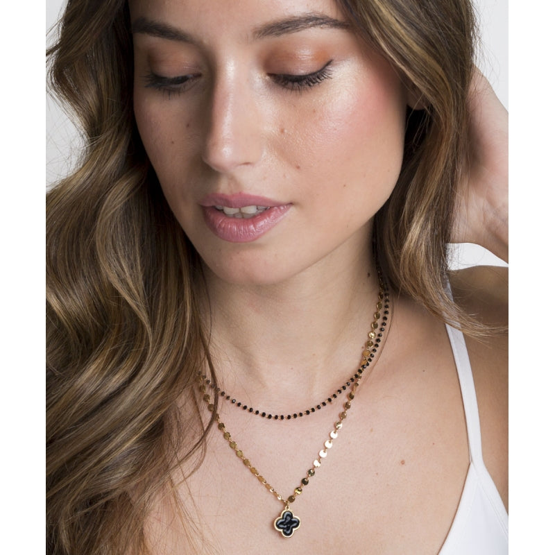 Este collar corto destaca por su delicado diseño de mini cristales negros combinados con una cadena metálica compuesta por pequeñas piezas, centrando una piedra con forma de flor de cuatro pétalos. Fabricado en acero inoxidable con un baño de oro de 14 quilates, ofrece durabilidad y un acabado sofisticado en tono dorado. Sus 44 cm de longitud, junto con el colgante de 1.5 cm y la cadena de extensión, permiten un ajuste perfecto. Ideal para realzar cualquier look con elegancia y resistencia. Composición: cristal, acrílico y acero inoxidable.