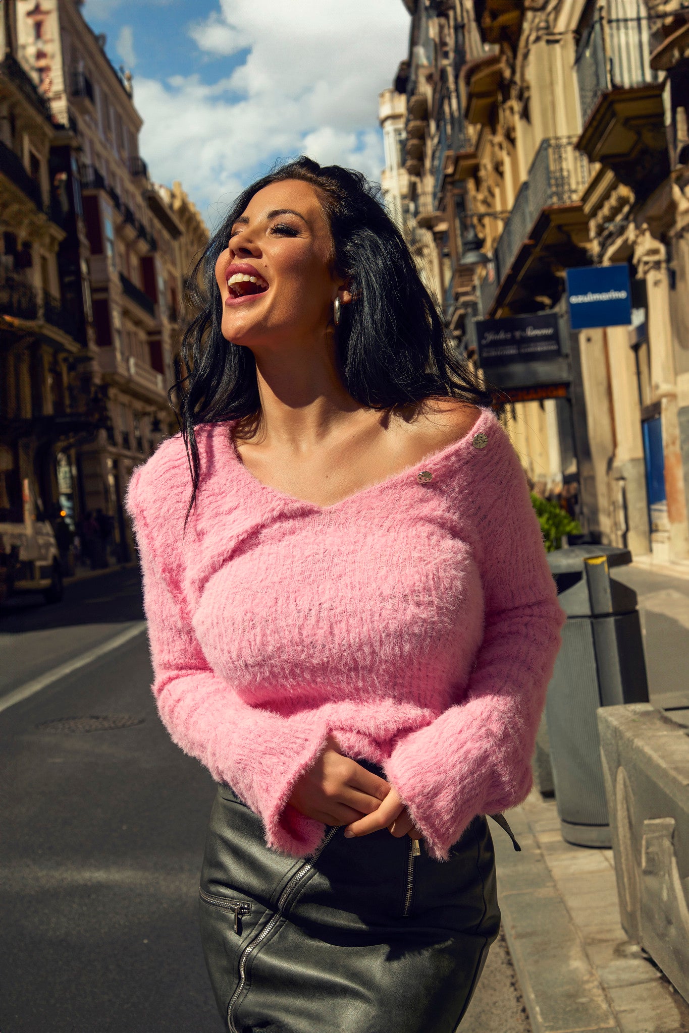 Dieser Strickpullover in Buganvilla aus Kunstfell besticht durch seinen eleganten V-Ausschnitt mit asymmetrischem Kragen, der einen modernen und raffinierten Touch verleiht. Die langen, ausgestellten Ärmel bieten ein fließendes und bequemes Design, während metallische Details wie die seitliche Brosche und die drei silbernen Knöpfe am Ausschnitt ein exklusives Finish hinzufügen. Hergestellt aus 100 % Polyamid/Nylon, vereint er Stil und Weichheit für vielseitigen Gebrauch bei jeder Gelegenheit.