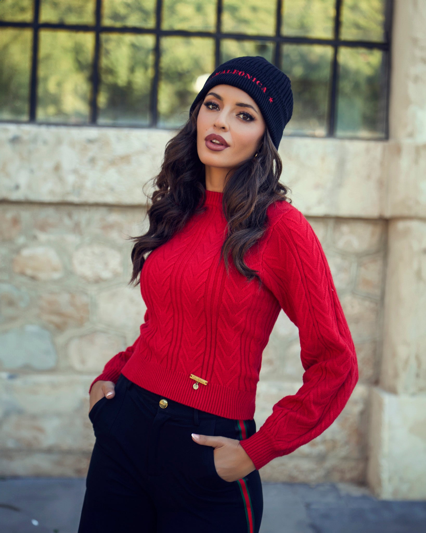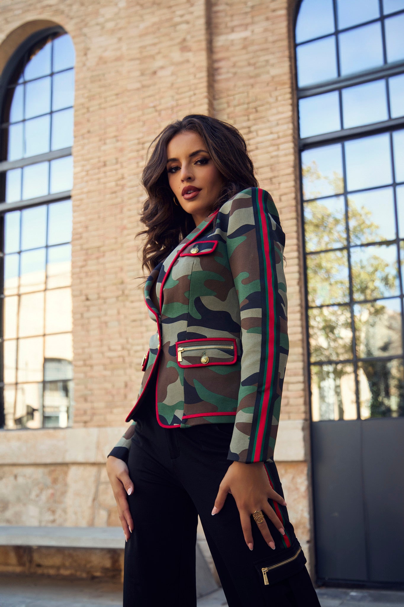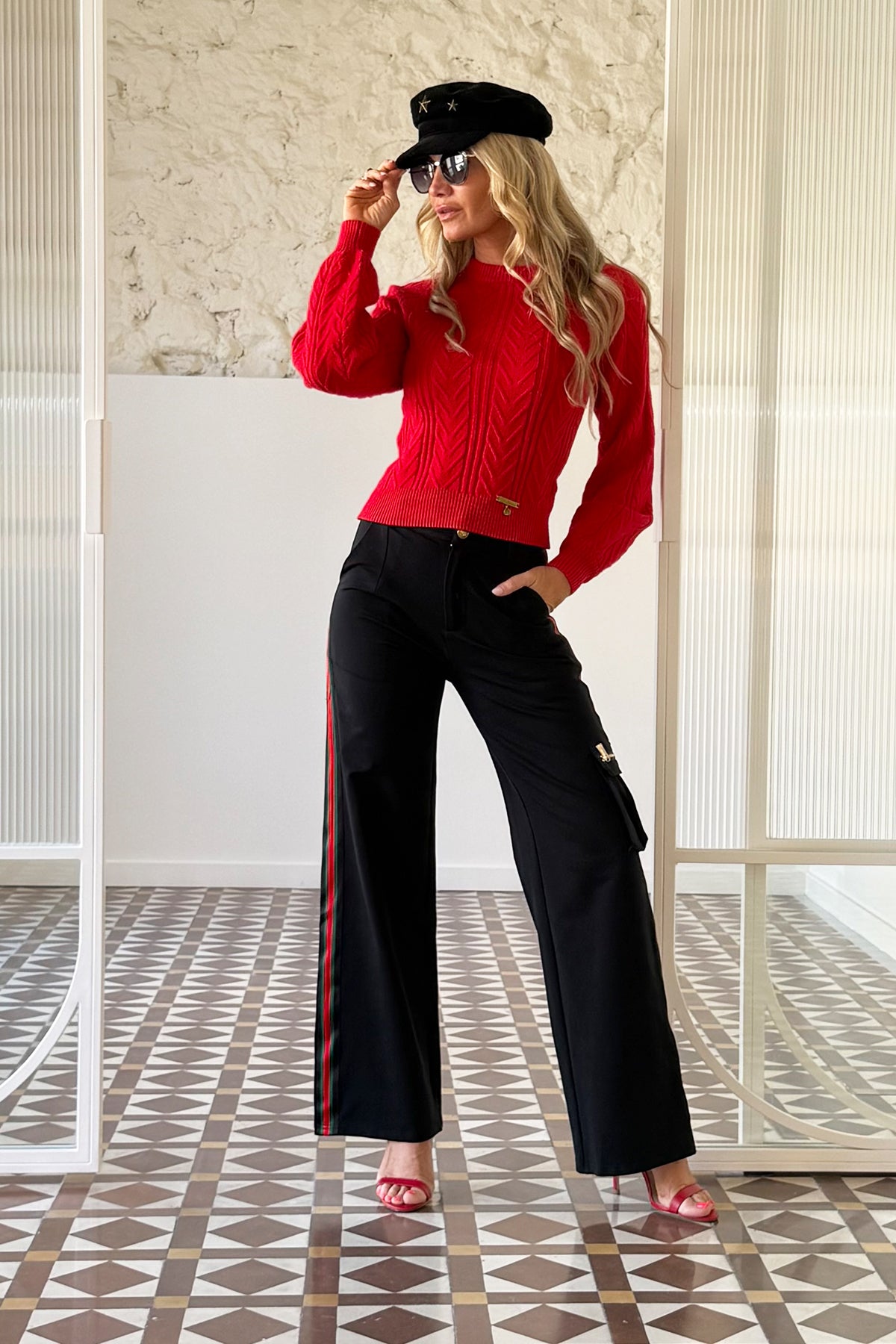Diese schwarze Cargo-Hose vereint Stil und Funktionalität dank ihres seitlichen Streifens in Grün und Rot, der einen modernen und markanten Akzent setzt. Sie verfügt über seitliche Taschen mit goldfarbenem Reißverschluss und zwei obere Taschen. Der Verschluss mit Knopf und Reißverschluss sowie die Gürtelschlaufen sorgen für einen bequemen und praktischen Sitz. Hergestellt aus 93 % Baumwolle und 7 % Elasthan bietet sie den ganzen Tag über Komfort und Flexibilität. Perfekt für alle, die ein vielseitiges Kleidungsstück mit liebevollen Details suchen.