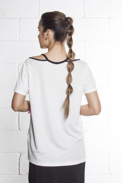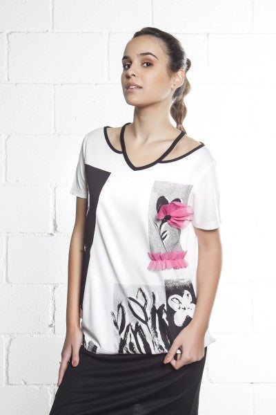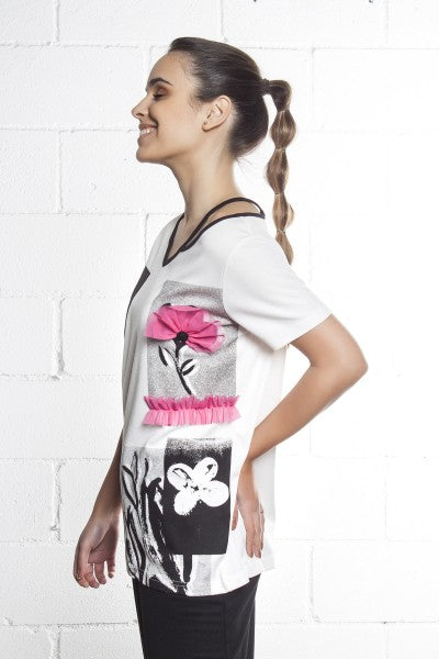 Weißes Kurzarm-T-Shirt, V-Ausschnitt mit schwarzem Besatz, kurze Ärmel, Vorderseite mit Blumendruck und rosa Applikation