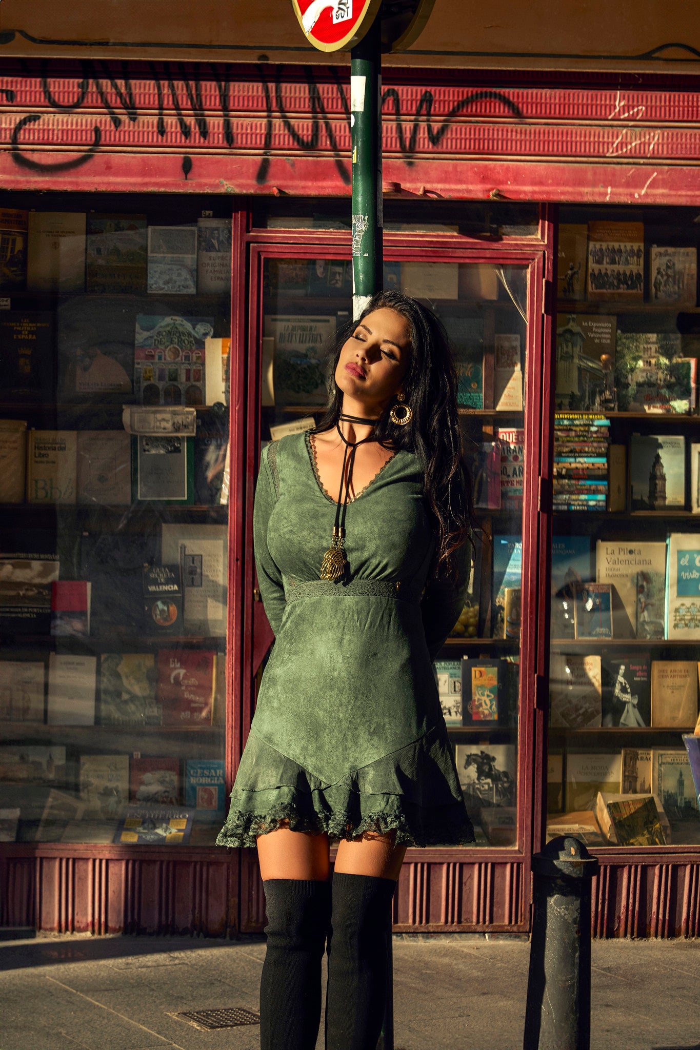 Dieses kurze Kleid aus grünem Wildlederimitat verbindet Eleganz und Komfort mit seinem V-Ausschnitt und zarten Spitzen- und Volantdetails am Saum, die eine feminine und raffinierte Note verleihen. Der seitliche, unsichtbare Reißverschluss erleichtert das Anziehen und sorgt für ein makelloses Finish. Hergestellt aus 94 % Polyester und 6 % Elasthan bietet es Flexibilität und Strapazierfähigkeit, ideal für Veranstaltungen, die Stil und professionellen Komfort erfordern. Perfekt, um mit einem frischen und eleganten Look aufzufallen.