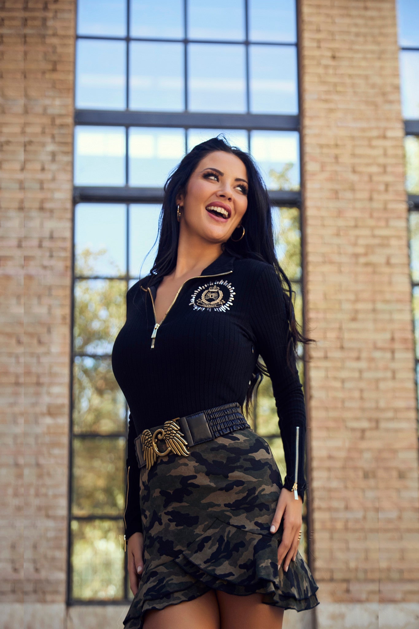 Dieses kurze Kleid kombiniert zwei Stoffe für einen modernen und vielseitigen Stil. Das schwarze, gerippte Oberteil mit Stehkragen und Reißverschlüssen in der Mitte und an den Ärmeln sorgt für eine bequeme Passform und einen Hauch von Raffinesse. Das mit silbernen Pailletten bestickte Logo verleiht ein elegantes Detail. Der bedruckte Camouflage-Rock mit Volants schafft Bewegung und Frische, während der unsichtbare seitliche Reißverschluss das An- und Ausziehen erleichtert. Mit Fasern aus Viskose, Elasthan und Baumwolle bietet es Komfort und eine perfekte Passform für jeden Anlass.