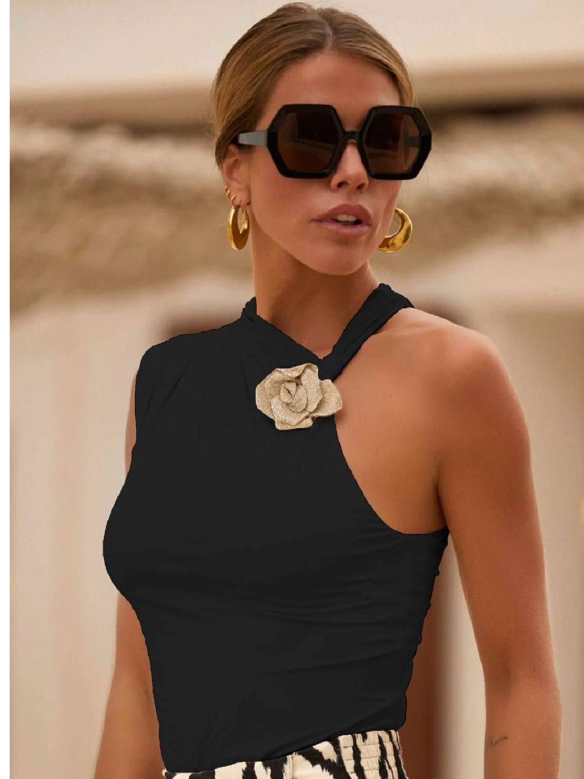This bodycon dress with a frayed halter neck features one sleeve set higher than the other and a clasp detail on the side for a unique look. The back is open with buttons down the center and a tie at the back of the neck, providing a perfect fit.