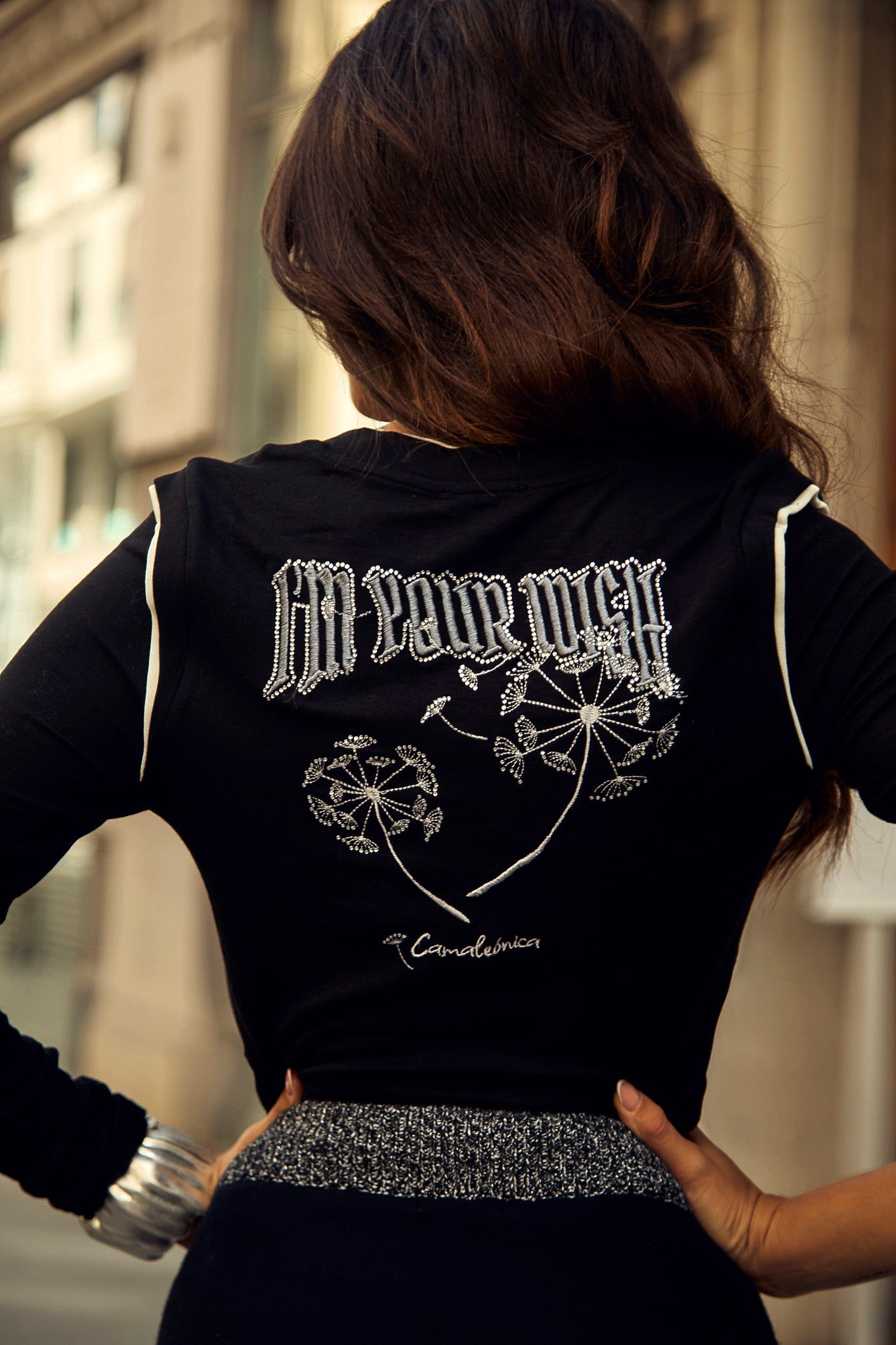 This black long-sleeve shirt combines style and elegance with subtle details. It features a white trim on the V-neck and sleeves, along with a small ruffle on the shoulder that adds a delicate and feminine touch. On the back, a gray embroidery with the phrase "I'm your wish" adds a special character, while the rhinestone details contribute to a sophisticated finish. Ideal for those looking for a versatile garment with attention to every detail.