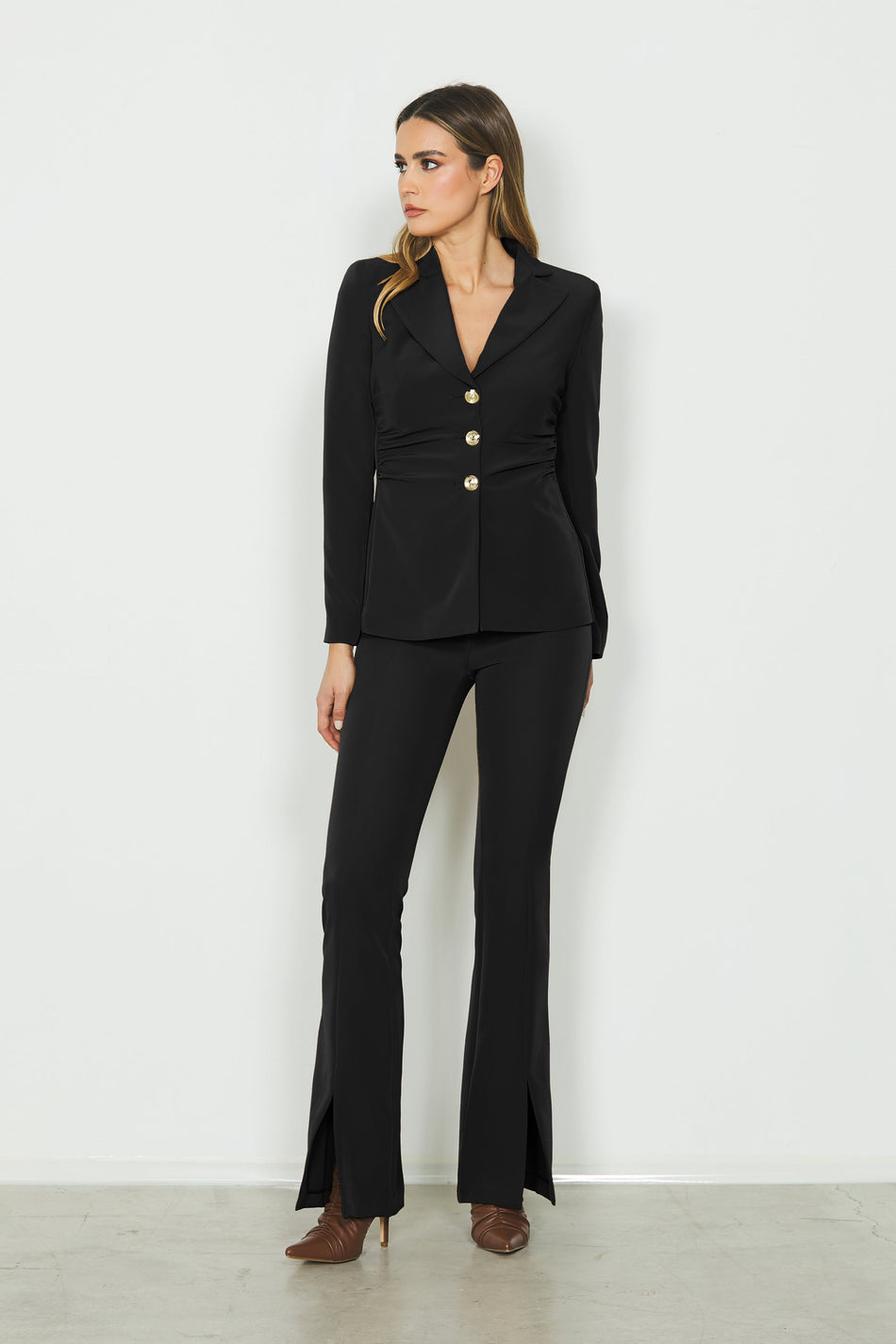The Vanessa Jacket in black is an elegant and versatile garment. Its jewel buttons give it a touch of sophistication. In addition, its draping at the waist highlights the feminine figure. Ideal for any occasion, the perfect complement to your style.