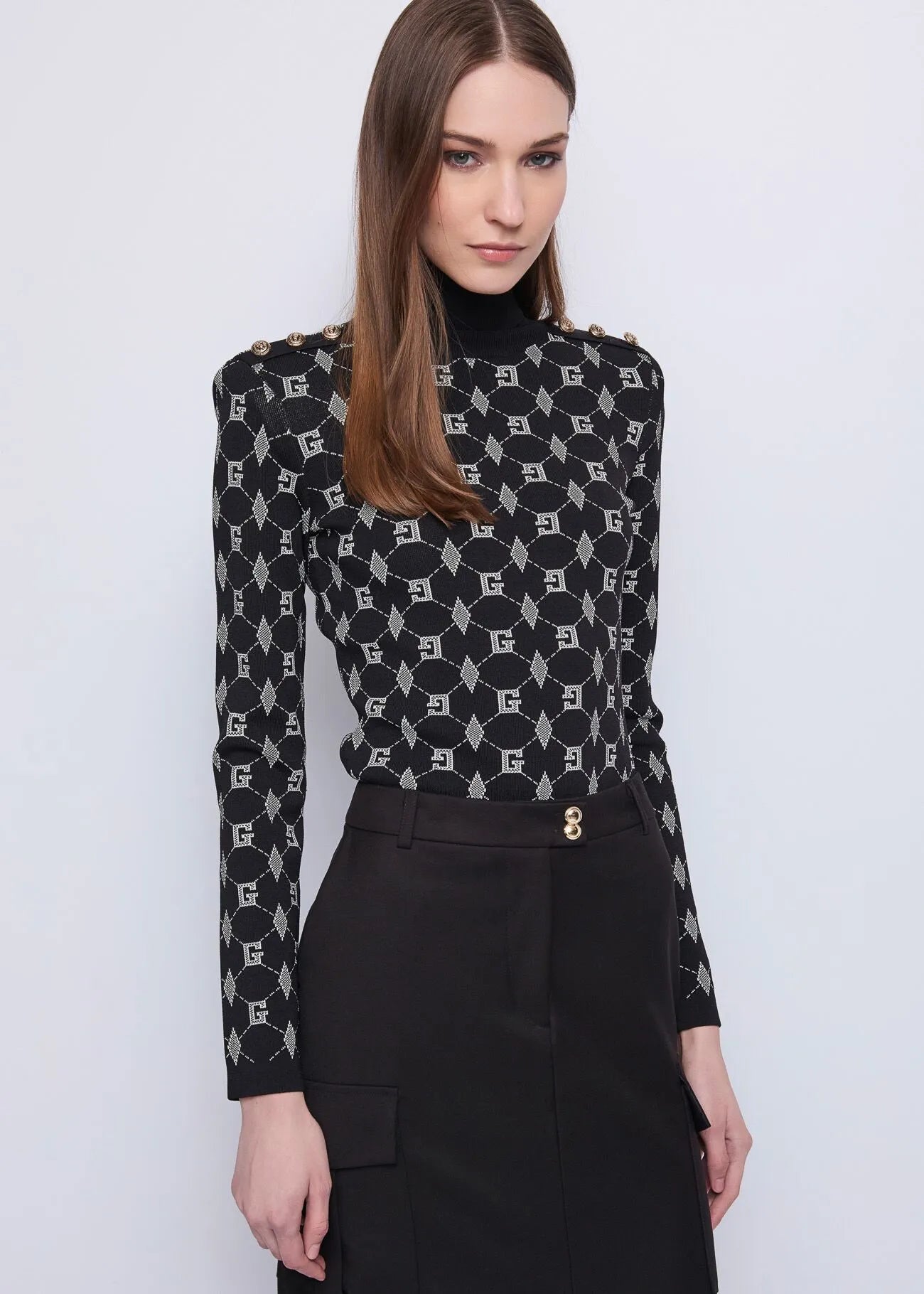 Discover the turtleneck sweater in a soft viscose blend, designed to offer comfort and style. Its integral jacquard logo provides a sophisticated and modern detail, while the golden buttons complete a touch of distinctive elegance. Perfect for maintaining a current and comfortable look on any occasion.