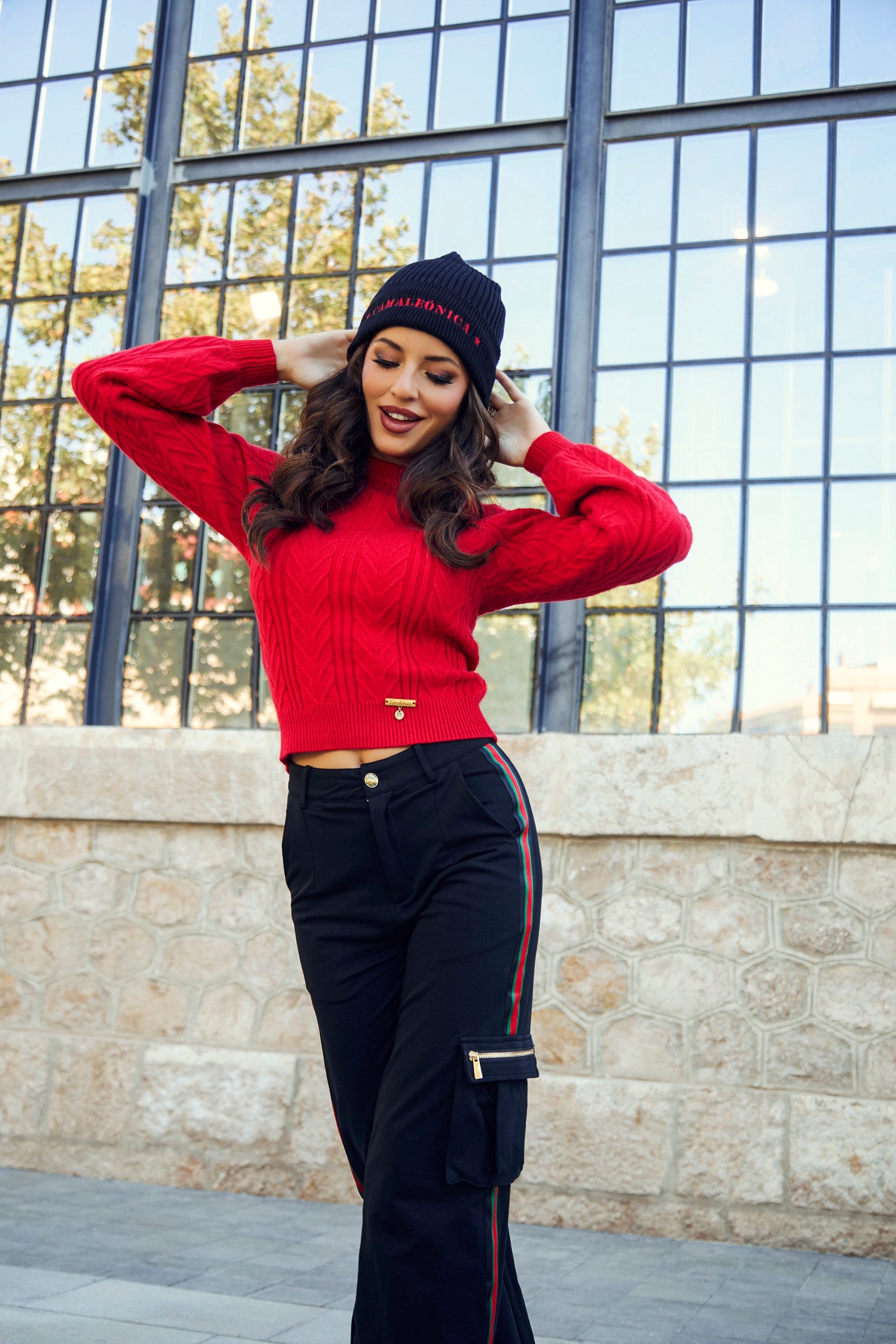 These black cargo pants combine style and functionality thanks to their green and red side stripe, which adds a modern and distinctive touch. They feature side pockets with gold zippers and two upper pockets. The button and zipper closure, along with belt loops, ensure a comfortable and practical fit. Made with 93% cotton and 7% elastane, they offer comfort and flexibility all day long. Perfect for those looking for a versatile garment with thoughtful details.