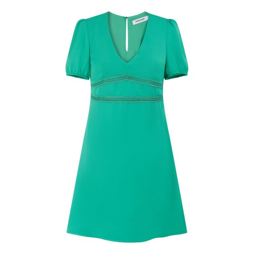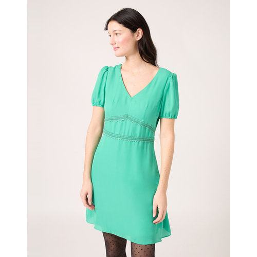 Short dress, aqua green, short sleeves, V-neckline with empire waist with lace trim