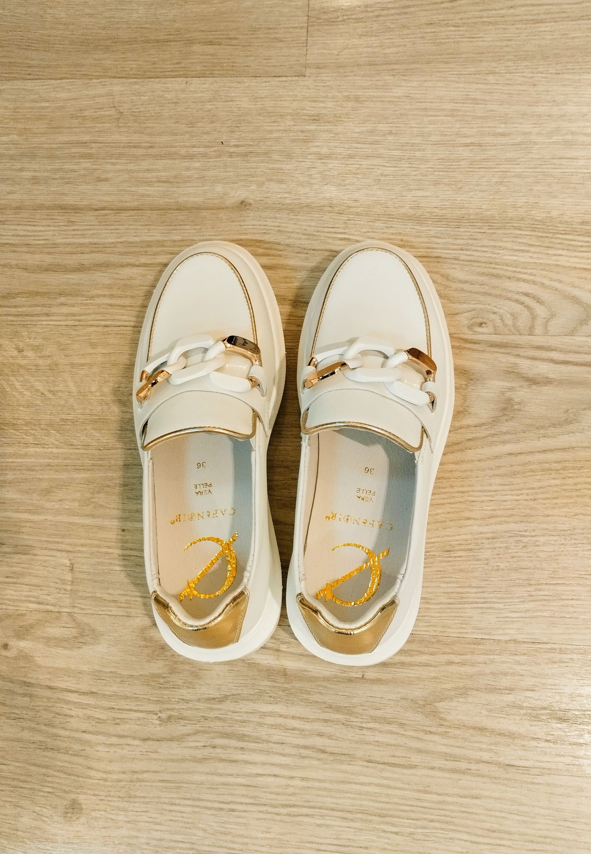 Discover the PLATINUM SHOES: moccasin style in white leather with gold trim and rubber sole. These shoes not only impress with their sophisticated design, but also provide comfort and durability. Perfect for any occasion.
