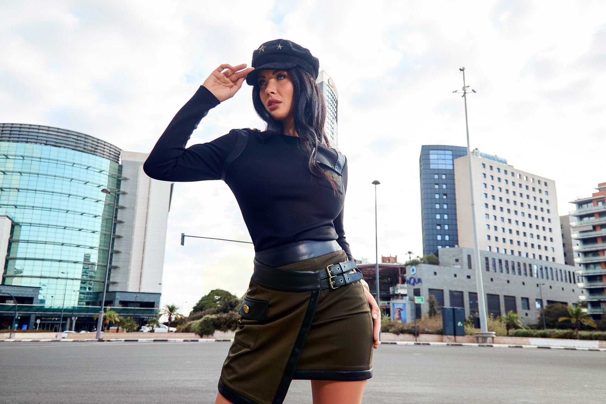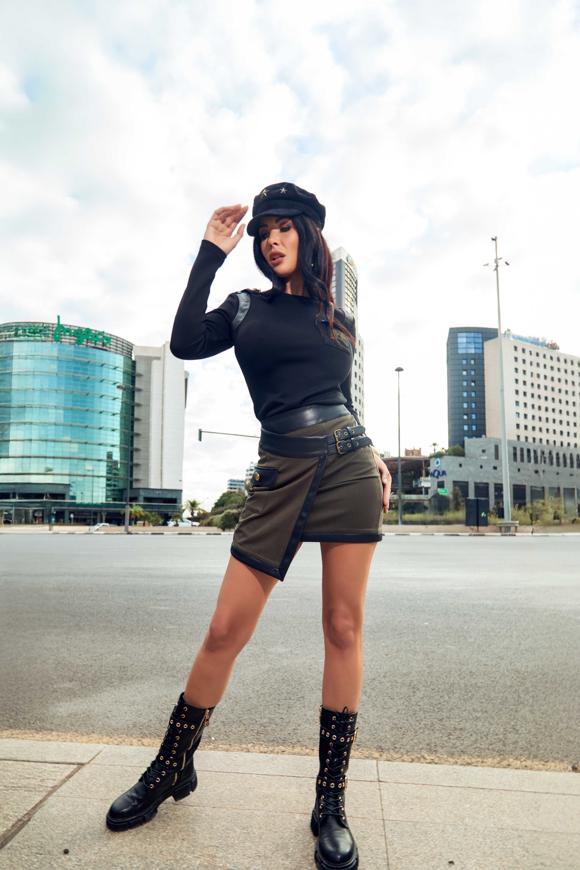 TOP MIMOSA CAMALEÓNICA Long-sleeve black t-shirt that combines sophistication and functionality. It stands out for its chest pocket with an eco-leather flap and a golden button featuring the brand logo, adding a distinctive touch of elegance. The shoulder loops and the golden detail on the sleeve complete a versatile and contemporary design. Made from quality fabric with 50% polyester, 45% viscose, and 5% elastane, it guarantees comfort and durability. The fiber blend provides breathability and a natural drape, while the elastane offers flexibility for movement. A versatile piece that adapts to both casual looks and more refined styles.