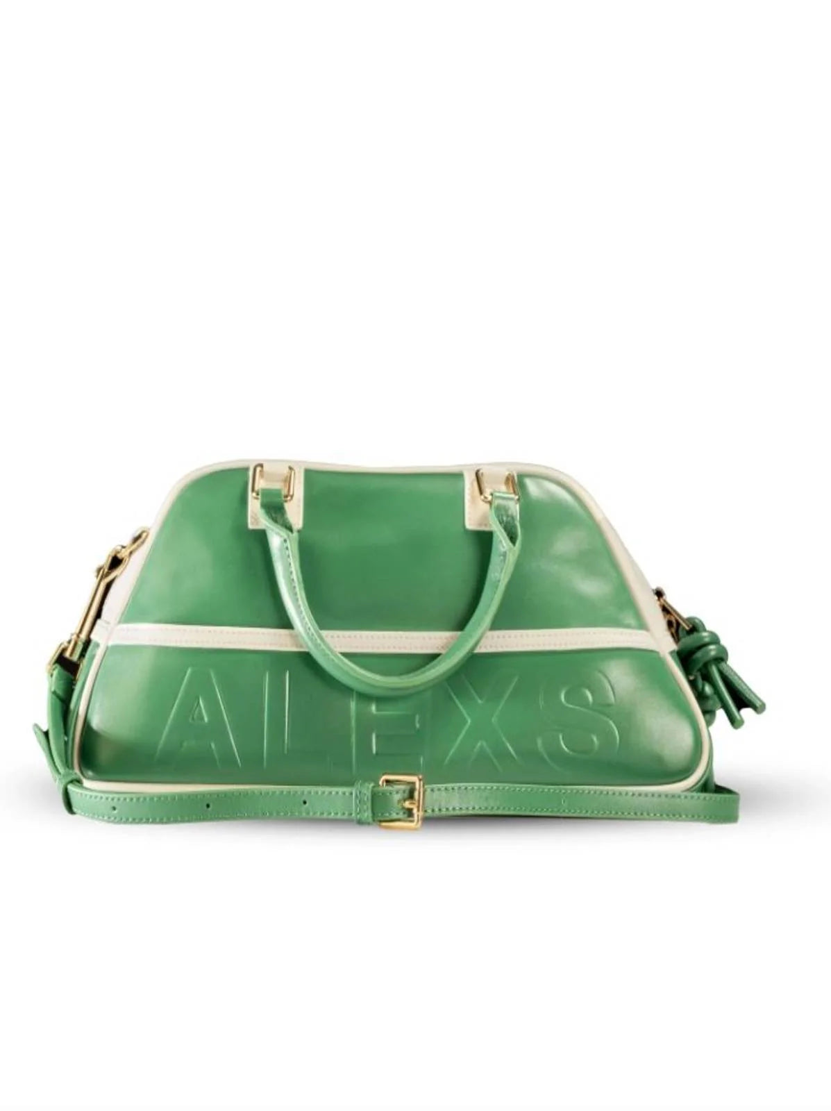 This green sports bag is made of high-quality leather and features a spacious interior with multiple pockets, providing easy storage for your belongings. Additionally, its custom design with an embossed logo, knot-shaped pulls, and decorative pocket make it an elegant and functional accessory. It includes an adjustable shoulder strap for added comfort. Exterior material: 100% cowhide leather. Interior: 95% cotton 5% cowhide leather. Dimensions: 39cm x 20cm x 9cm.
