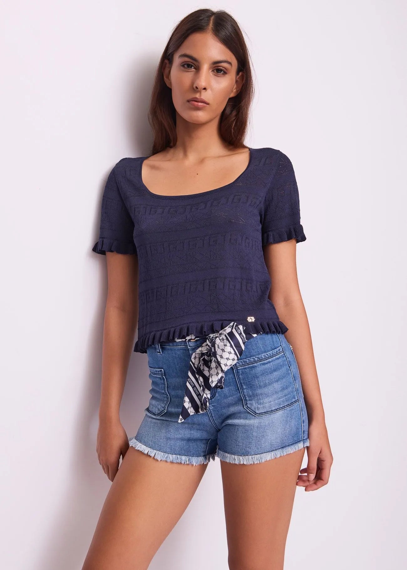 Knit T-SHIRT made with perforated fabric and a slightly rounded square neckline, offering a unique and comfortable garment with a soft feel on the skin. Perfect for a delicate and elegant look.