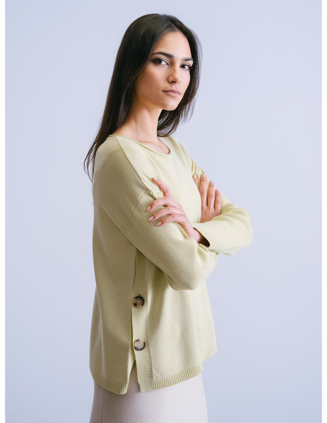 This boxy sweater in pastel yellow stands out for its comfortable and modern design. Its buttons and side slits give it a touch of originality. Ideal for complementing your clothes with style.