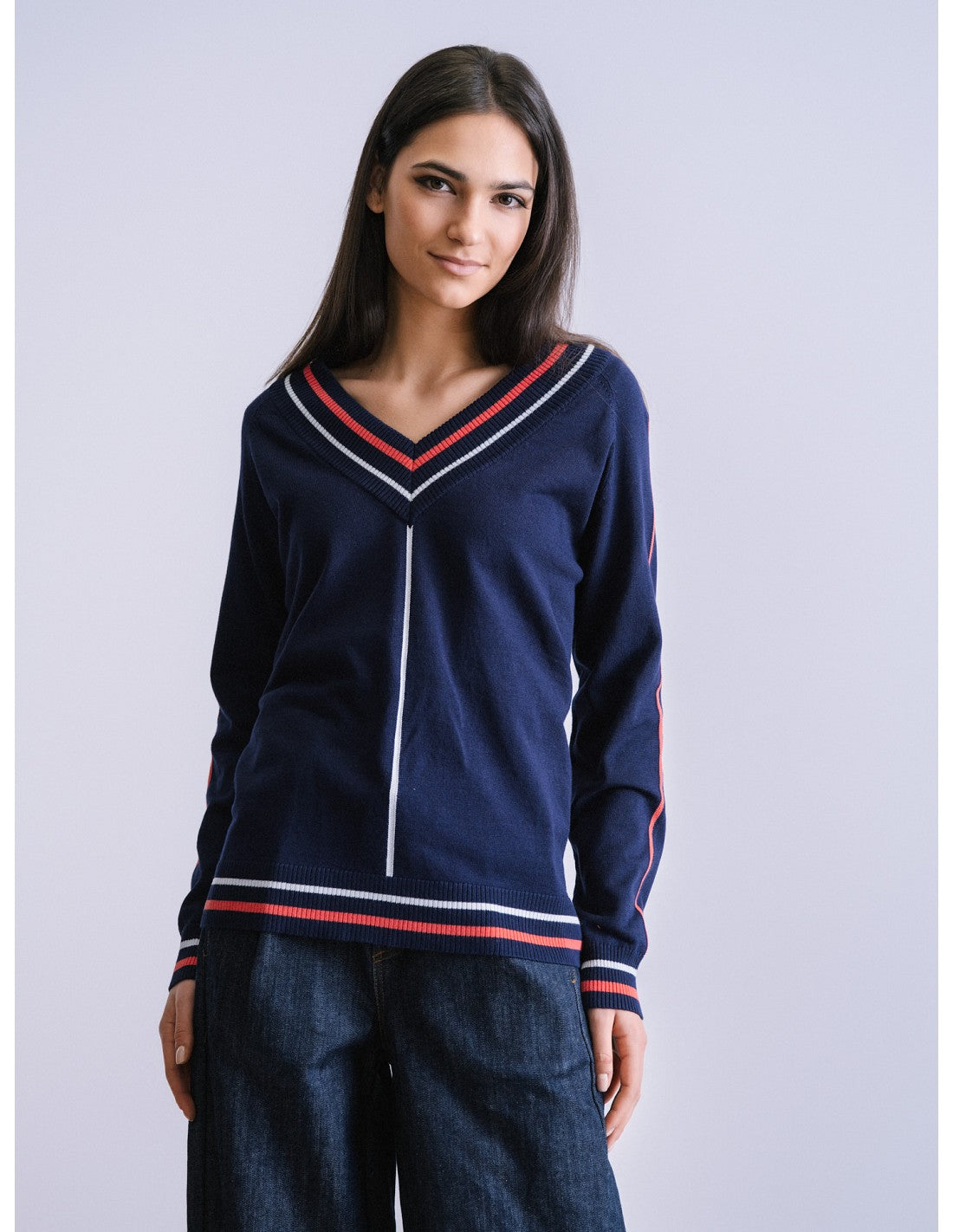 Enjoy the freshness and style that the navy blue sweater with white and coral stripe contrasts brings. Its versatile design enhances any look, adding a touch of color and dynamism that will accompany you on your days with comfort and elegance. Ideal for pairing with basic garments and feeling confident and fashionable.