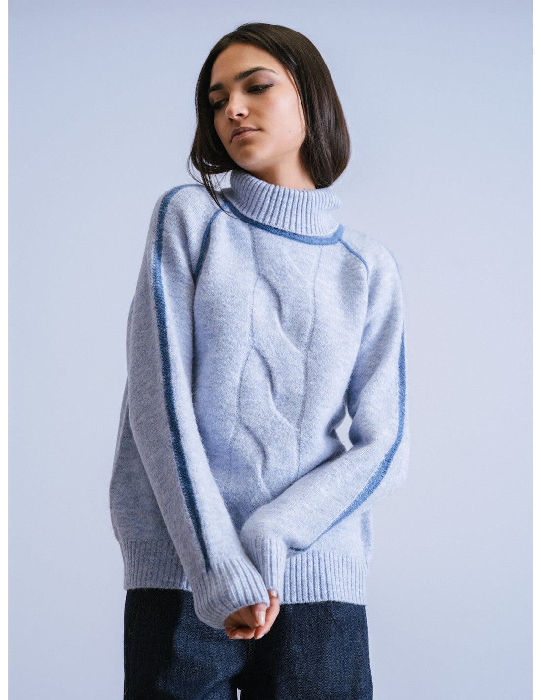 This light blue marl sweater stands out for its turtleneck and a central braid that adds texture and style. Its comfortable and cozy design is perfect for keeping you warm, while the soft tone makes it easy to pair with any look. Ideal for everyday wear, it offers warmth without sacrificing a touch of simple elegance.