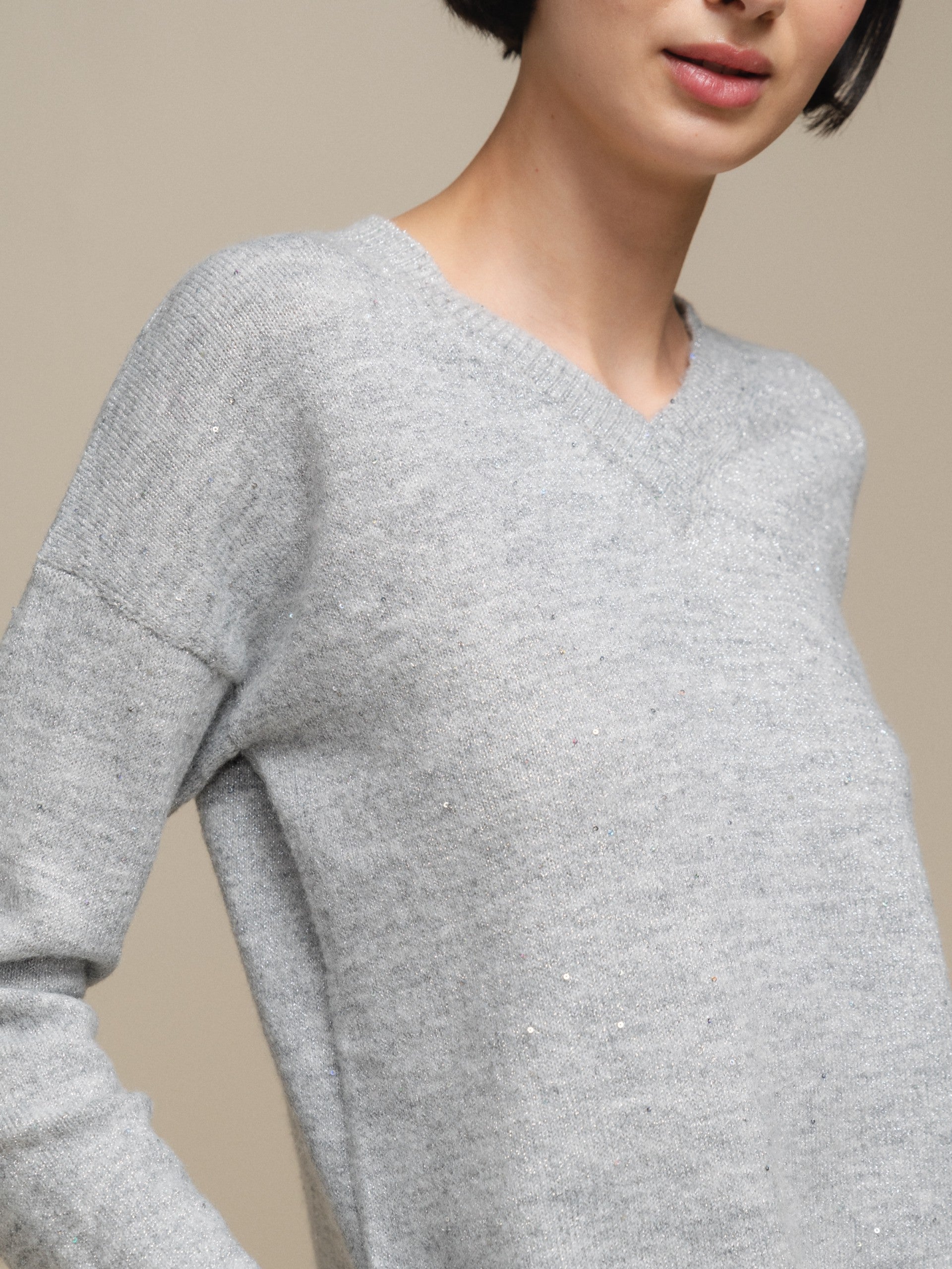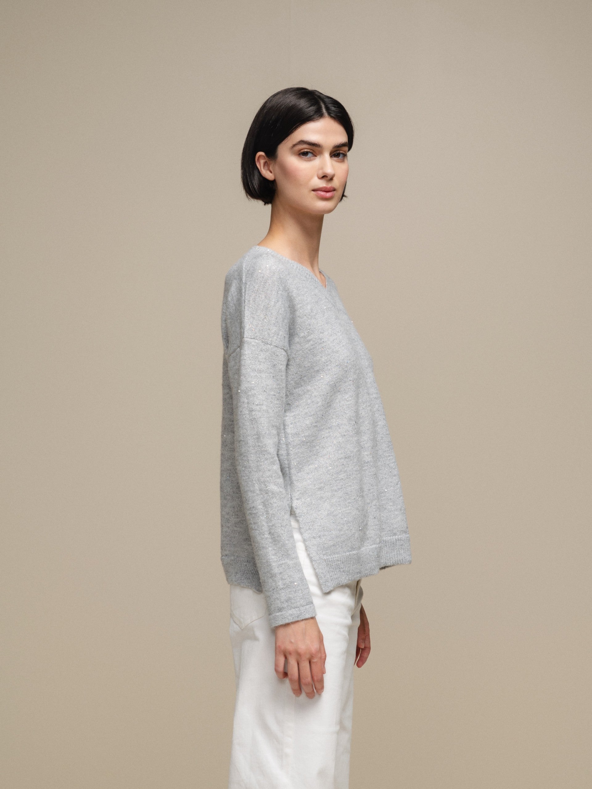 This modern sweater features a V-neck and an attractive heathered design in shades of gray with silver lurex, giving it a touch of subtle shine. Perfect for adding a touch of style to any outfit, while keeping you warm and comfortable.