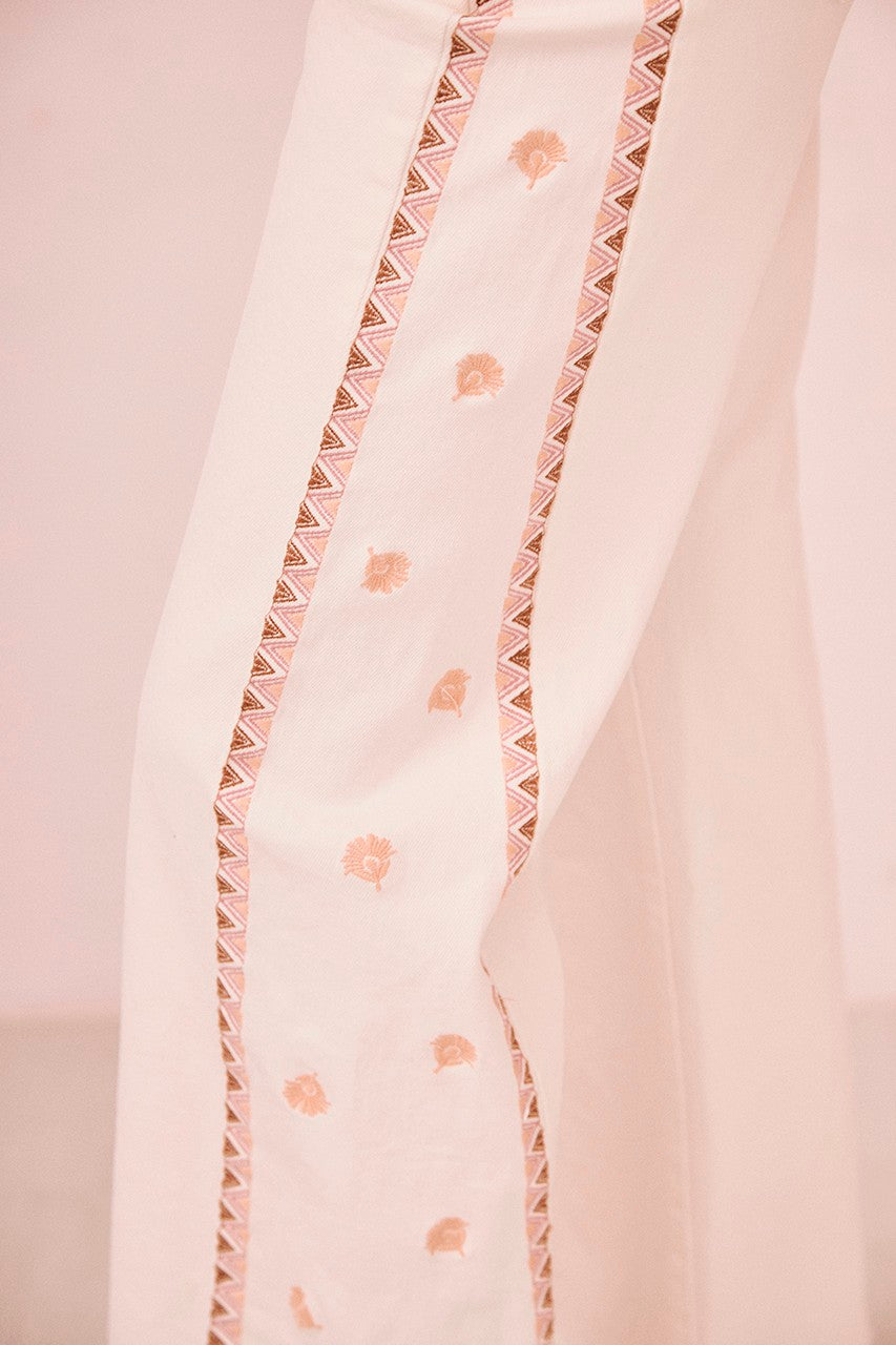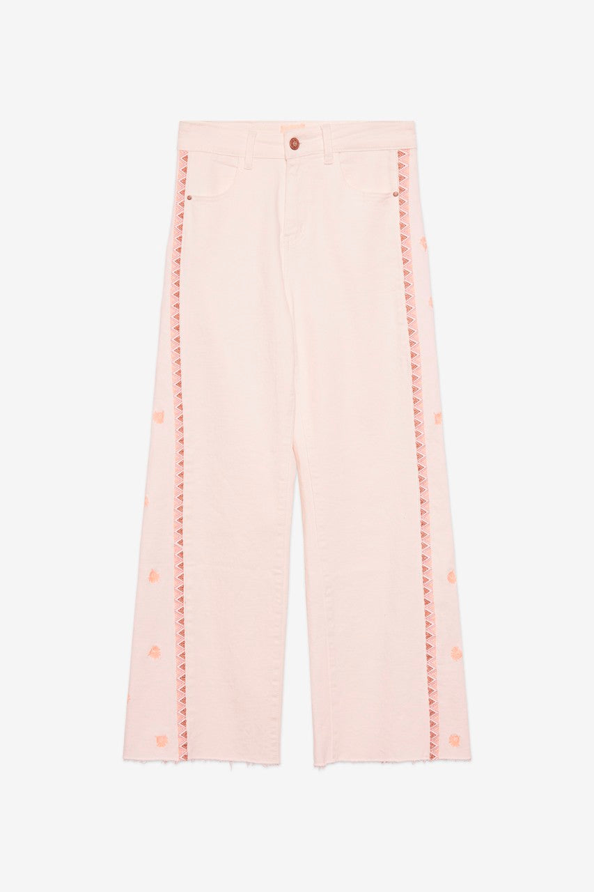 Slim long denim pants with frayed hem and fly zipper. Designed with embroidered pockets for a unique and modern style. Ideal for a casual look.