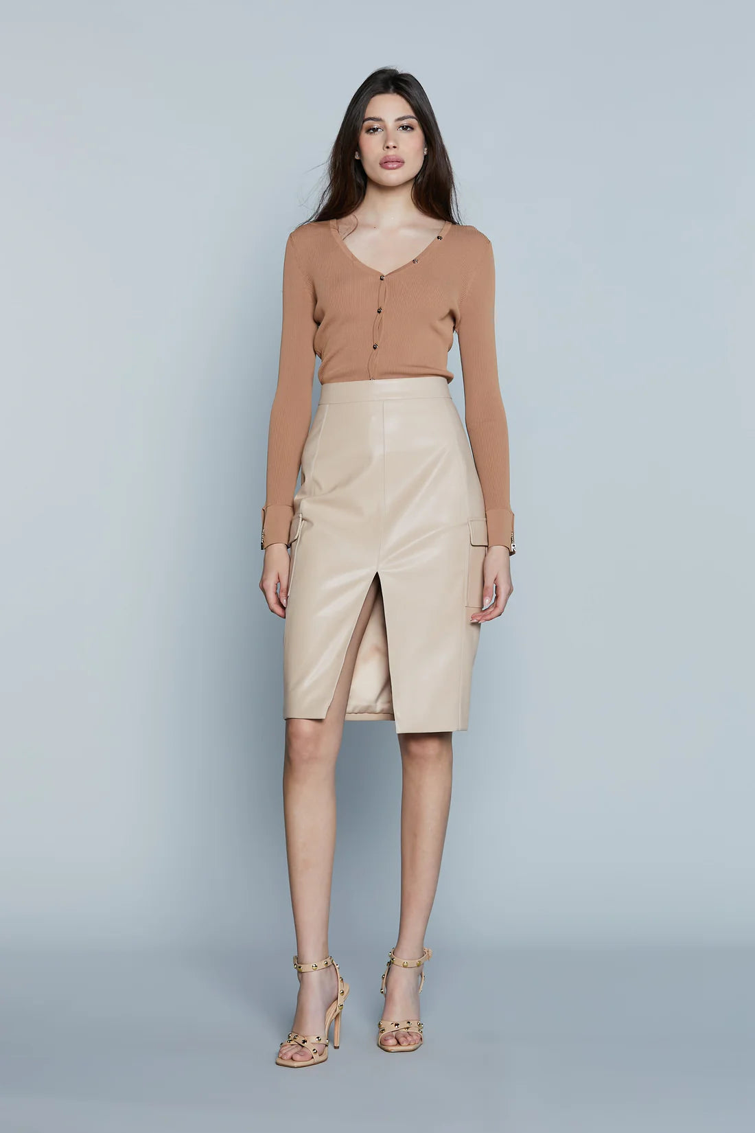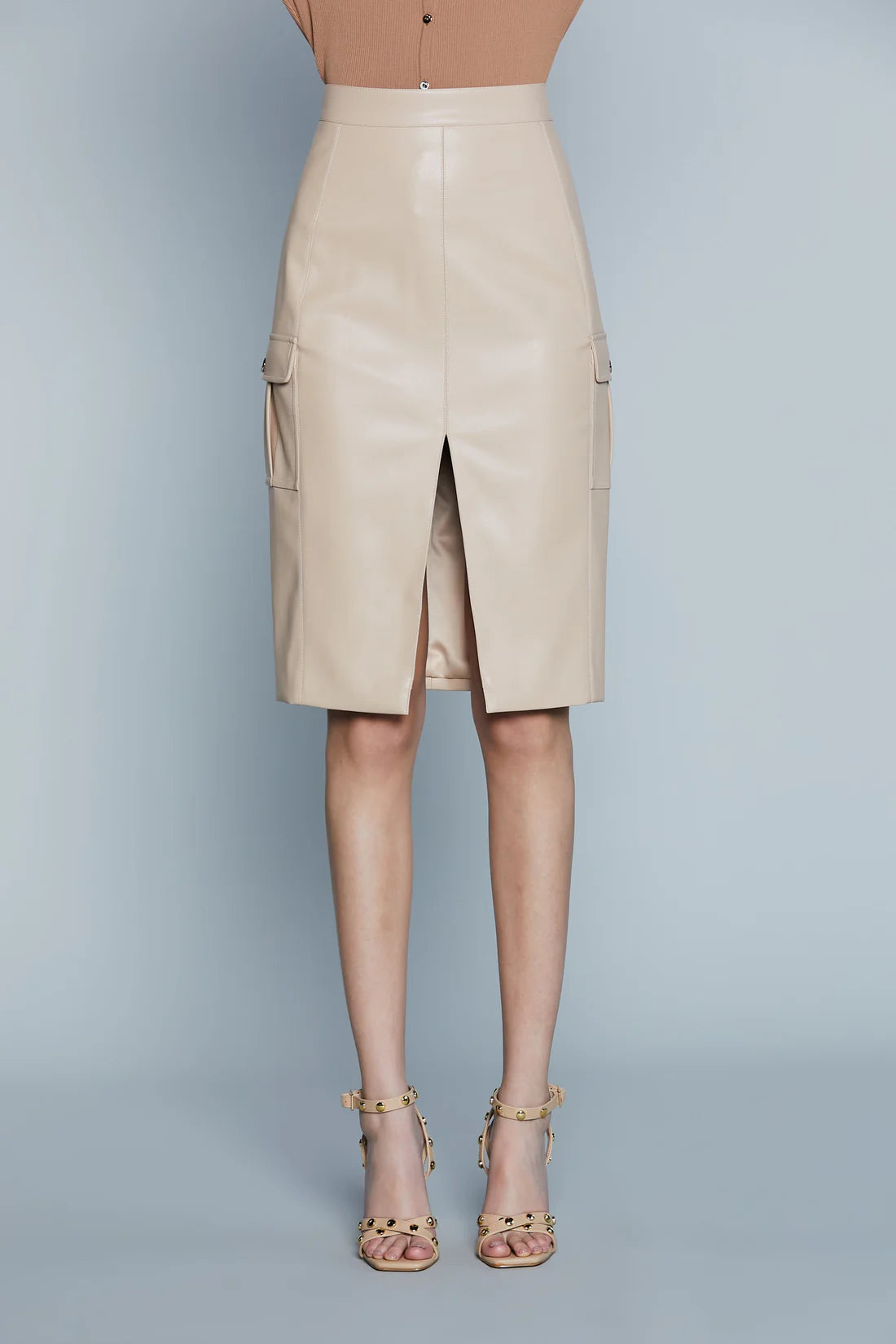 La jupe crayon taille haute Anastasy est une pièce élégante et moderne qui allie utilité et sensualité. Avec des poches latérales et une fente centrale qui donne du mouvement au modèle, cette jupe en cuir synthétique offre un style raffiné et audacieux. Fermeture éclair dorée dans le dos pour un ajustement confortable. 100 % polyuréthane.