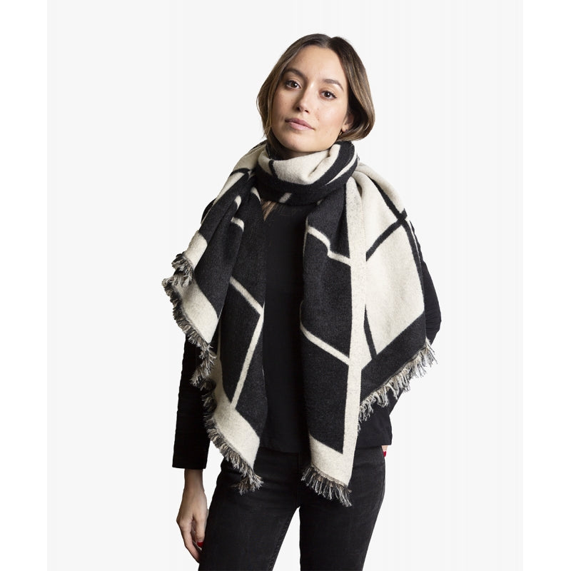 La couverture extra douce et chaude MANTA EXTRA présente un design géométrique en noir et blanc, avec une finition irrégulière et des franges des deux côtés. Réversible et confectionnée en 100 % polyester, elle offre chaleur et polyvalence en une seule pièce de 65 x 180 cm et un poids de 310 grammes, idéale pour apporter style et confort dans n'importe quel espace.