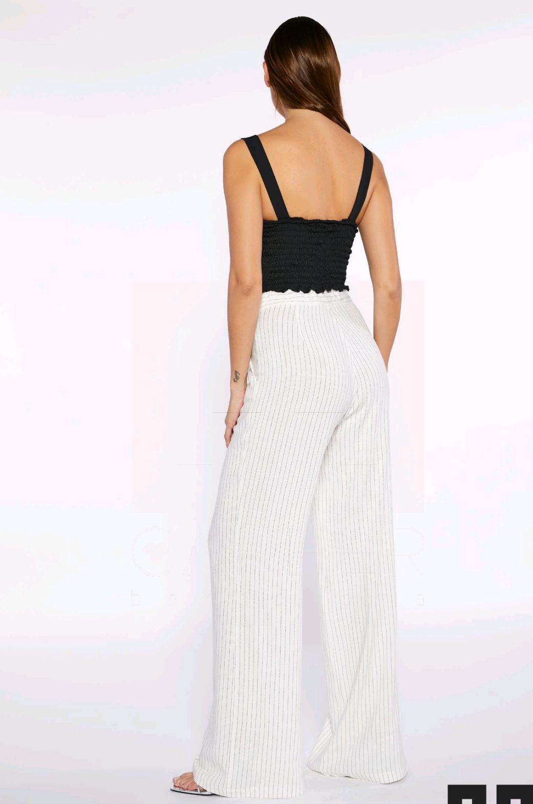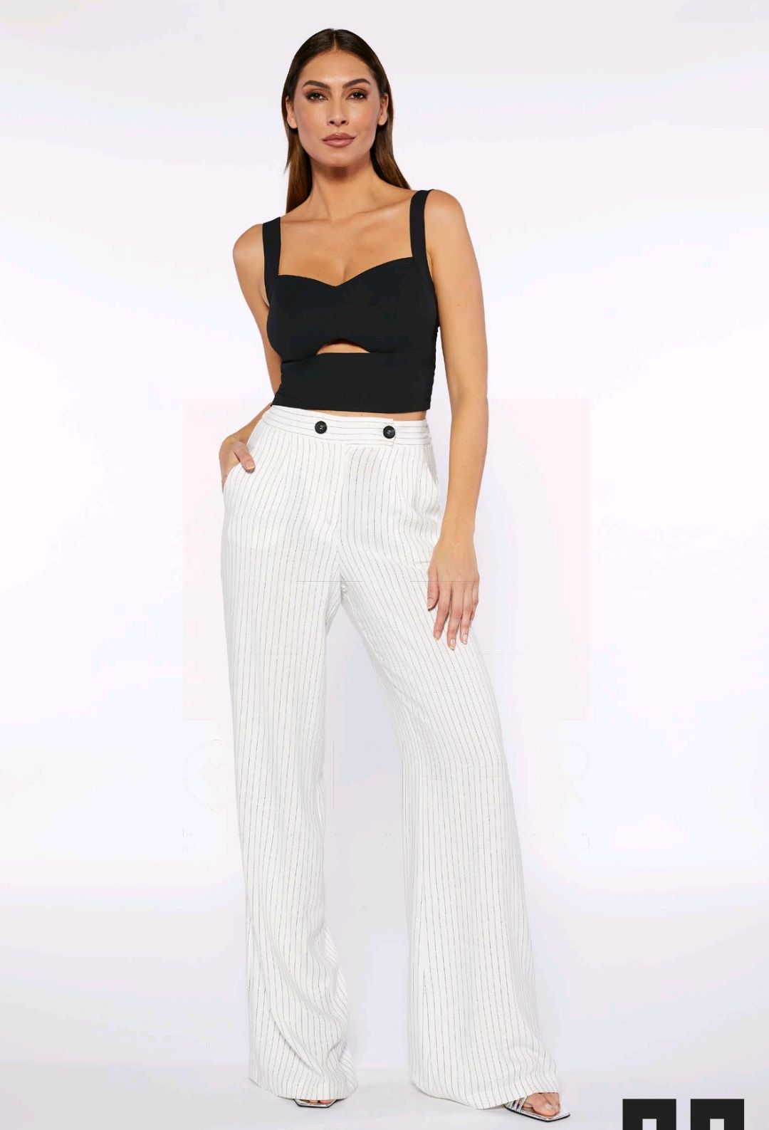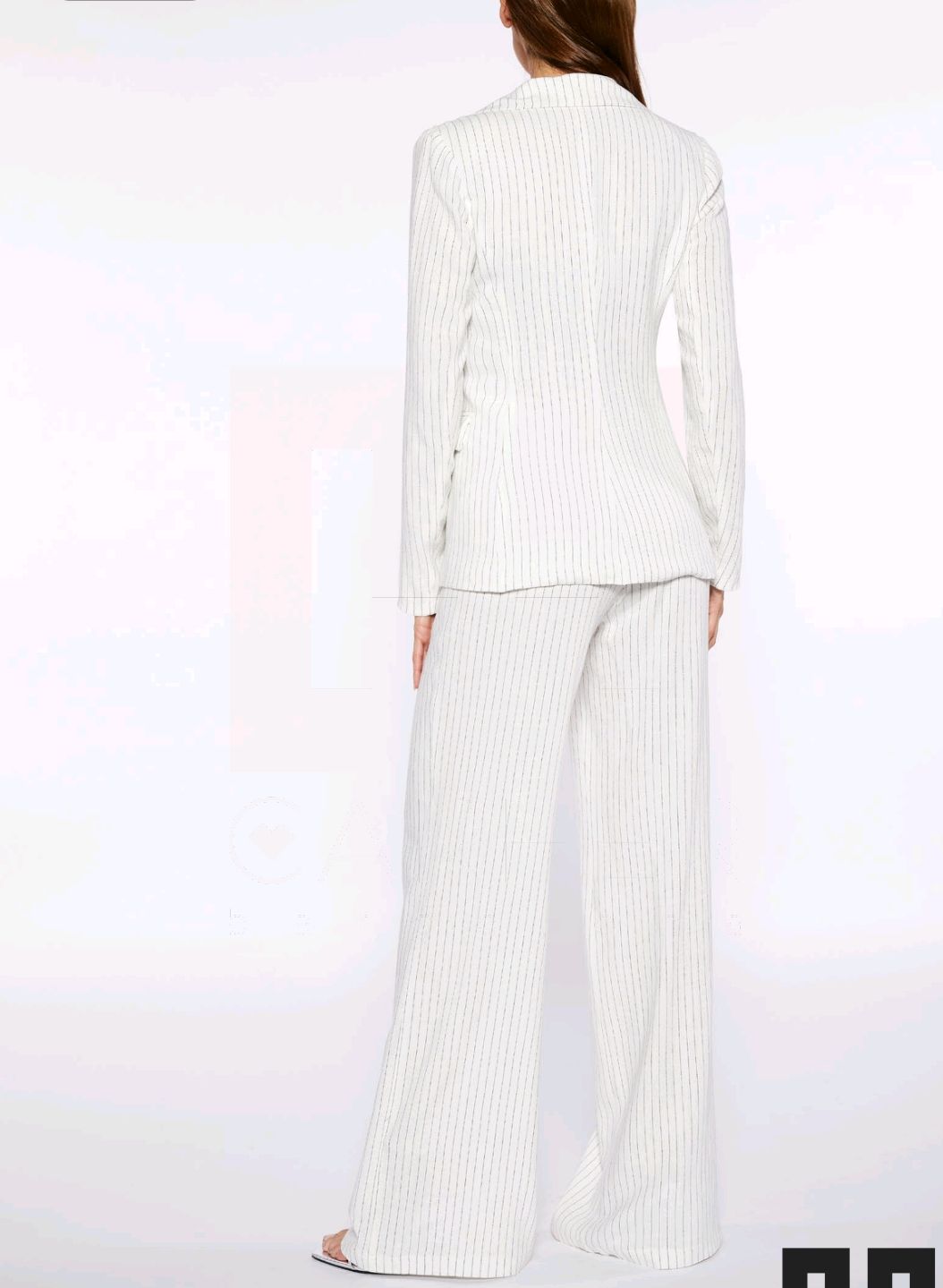 Pantalon blanc à fines rayures noires, jambe large, poches latérales en diagonale