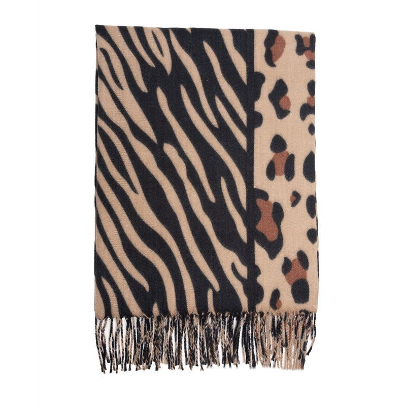 Esta pasmina extra suave y abrigada combina dos elegantes estampados animales, cebra y leopardo, en un color neutro negro-beige. Con unas medidas de 70 x 180 cm más flecos, ofrece versatilidad y comodidad para cualquier ocasión. Fabricada 100 % en poliéster, su tejido ligero de 220 gramos proporciona calidez sin peso excesivo, convirtiéndola en un accesorio perfecto para complementar y proteger del frío con estilo.