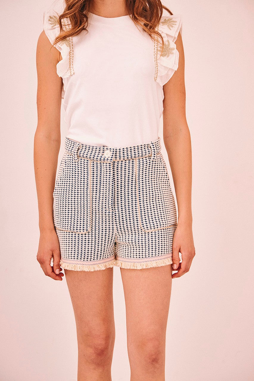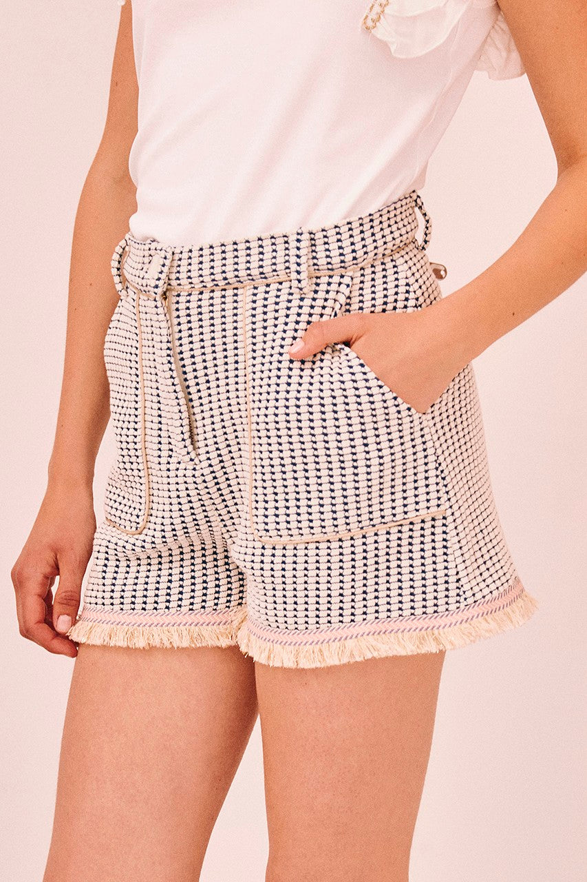 Le SHORT BLANCH est un short en coton jacquard avec poches, fermeture éclair et bouton. Son détail de franges beige sur l'ourlet lui donne une touche moderne et douce au toucher. Parfait pour un look décontracté lors des journées chaudes. Profitez du confort et du style avec ce short de haute qualité.