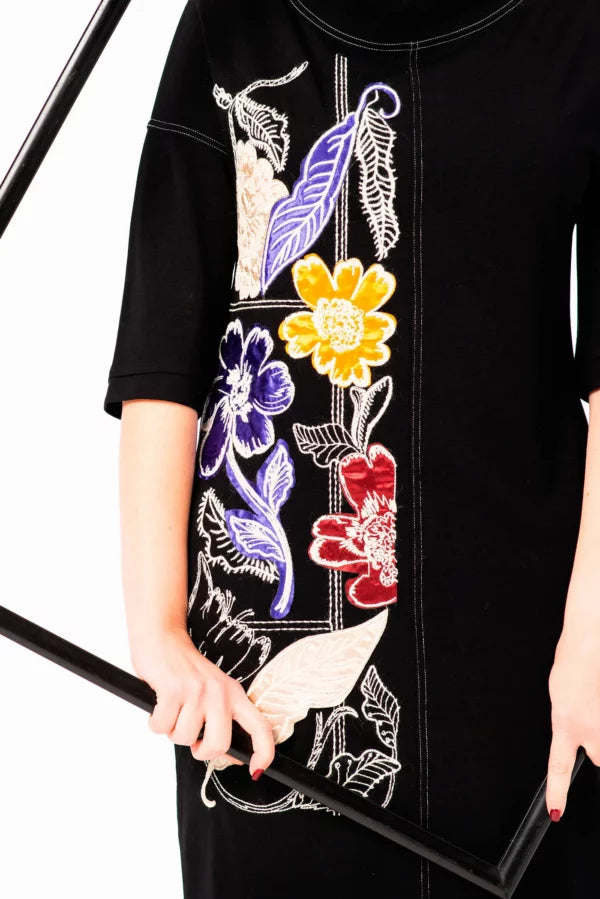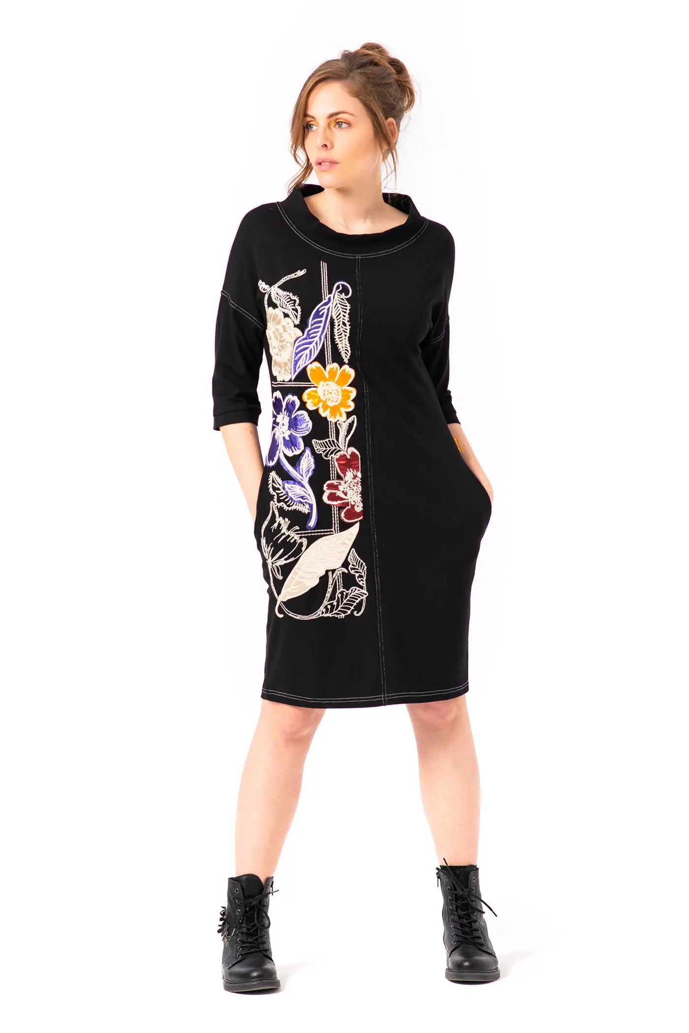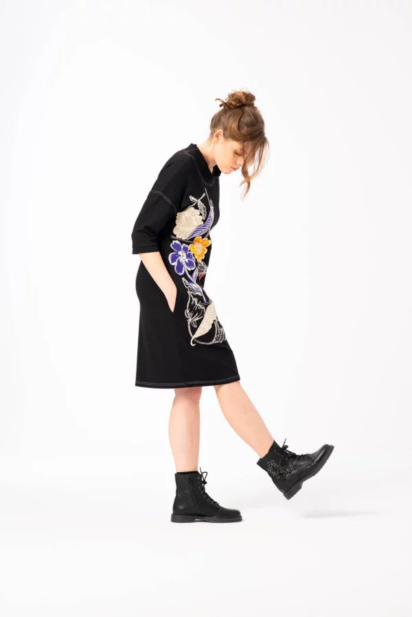 Habillez-vous avec style avec notre robe noire en tricot arrondi ! Avec ses surpiqûres blanches, ses poches pratiques et sa broderie élégante sur le devant, cette robe droite est parfaite pour toutes les occasions. De plus, le col montant et les manches courtes vous garderont confortable et élégant toute la journée. Ne le manquez pas !