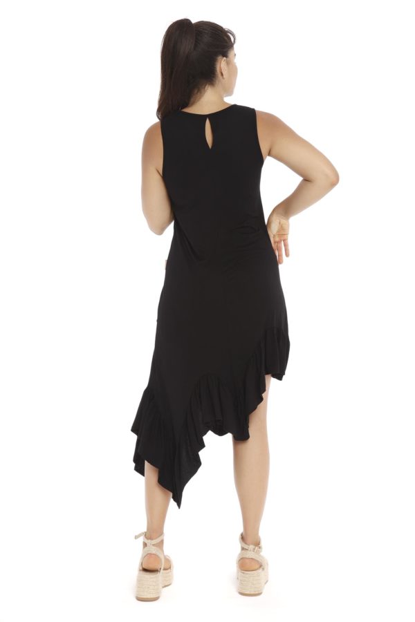 Cette ROBE BEGONIA noire fluide est dotée d'une élégante broderie florale qui lui confère une touche féminine. Il présente un design asymétrique sans manches, avec des volants et une encolure ronde. Idéal en toute occasion, il vous donnera une allure élégante et sophistiquée.