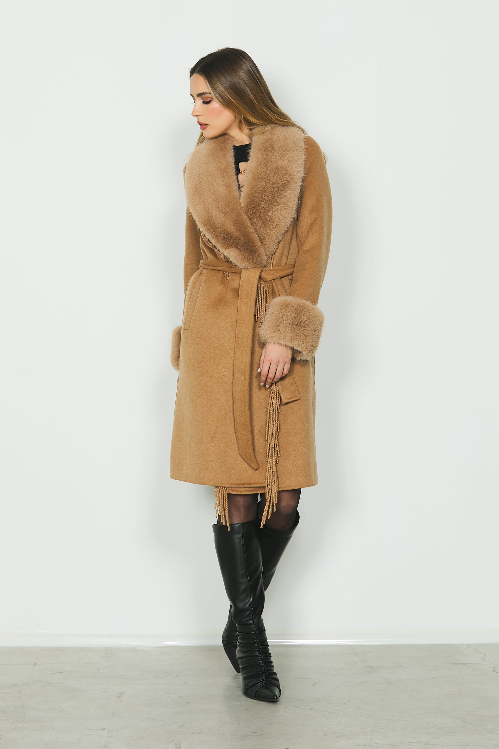 Ce manteau Guenda est parfait pour vous garder au chaud et à la mode en hiver. Avec son col chaud et doux et ses poignets en fourrure amovibles, vous pourrez l'adapter à toutes les occasions. Le décor de franges et sa double face en font un design unique et élégant. De plus, avec 50 % de laine, il vous gardera au chaud lors des journées froides.