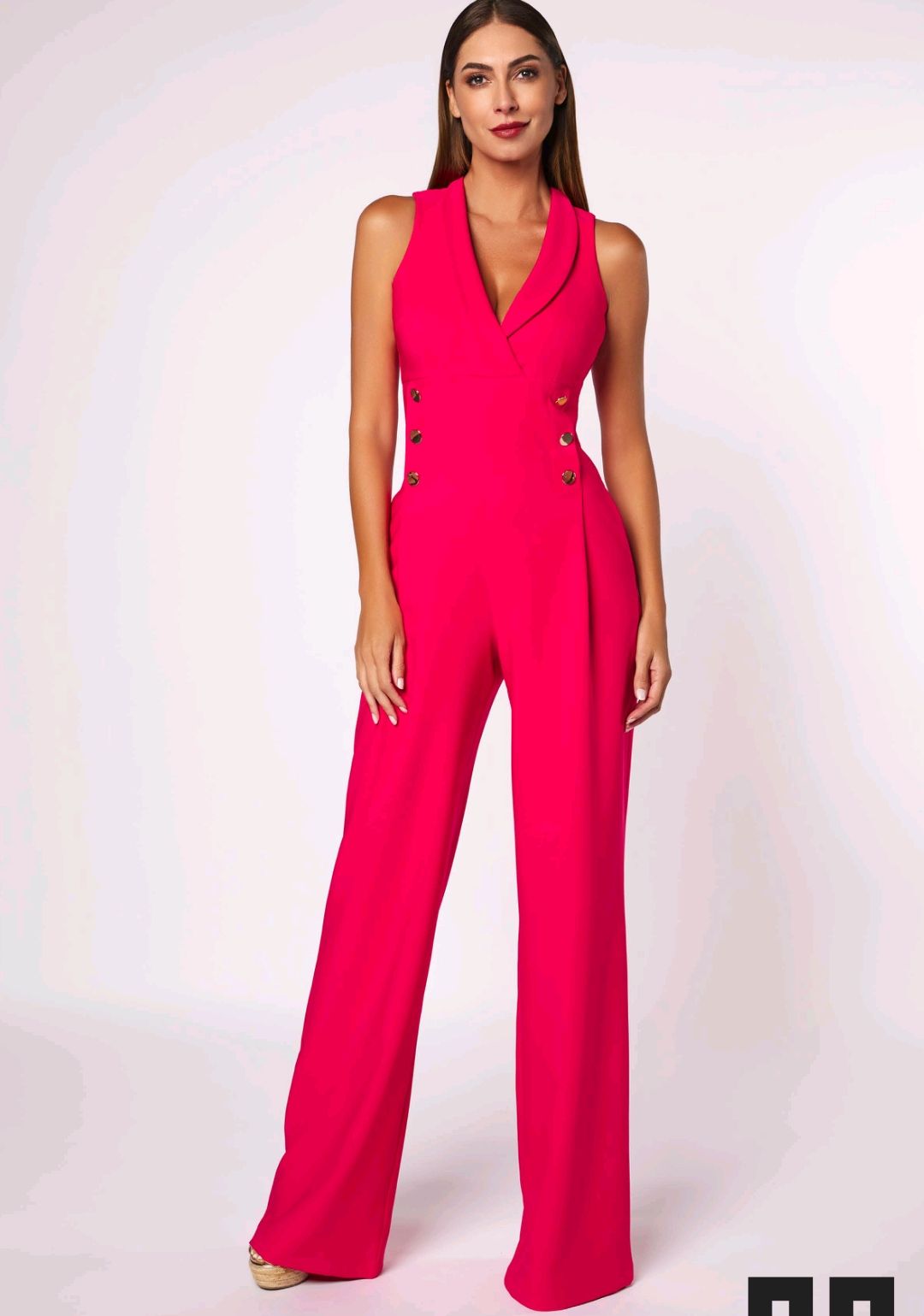 Cette élégante combinaison pantalon longue de couleur rouge présente un col smoking et une taille haute qui mettent en valeur la silhouette. La boutonnière dorée sur les côtés ajoute une touche de sophistication, tandis que la jambe large et les poches latérales offrent confort et fonctionnalité. Parfaite pour une occasion spéciale ou une sortie nocturne.