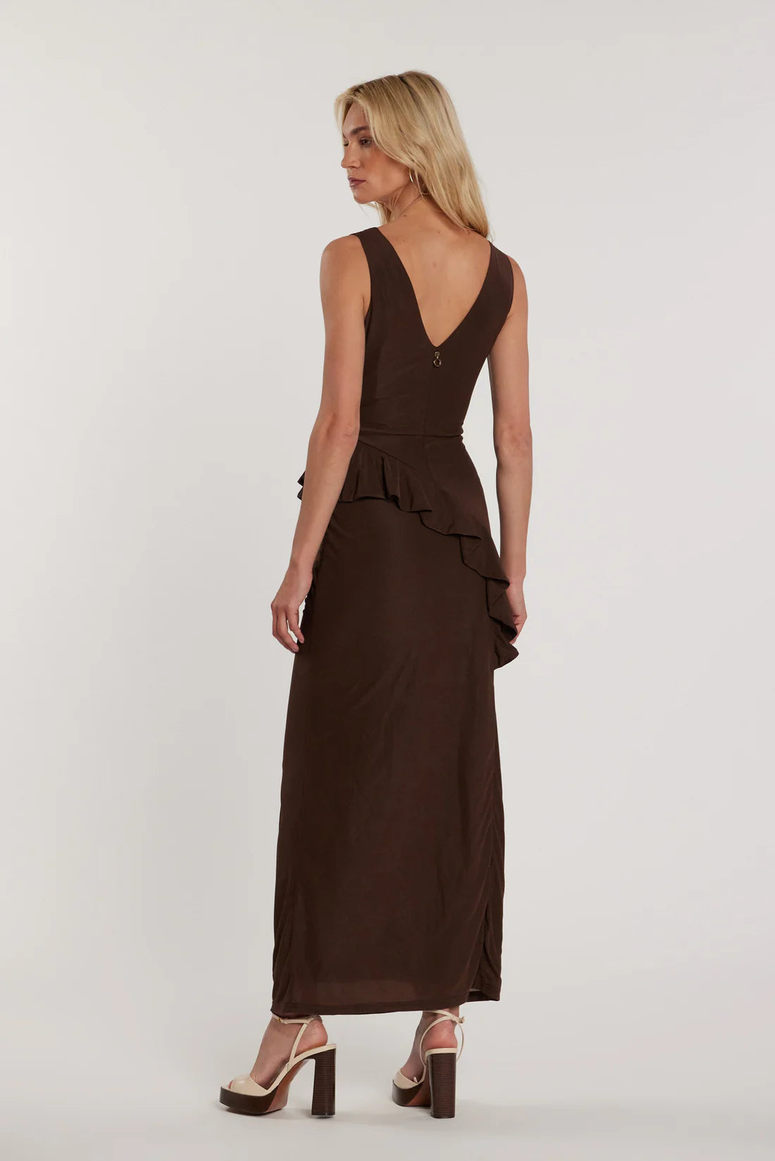 La robe longue sans manches Lane est un modèle sophistiqué qui allie élégance et mouvement. Son décolleté double en V distinctif met en valeur la silhouette, tandis que les plis, volants et fronces apportent dynamisme et texture à chaque pas.