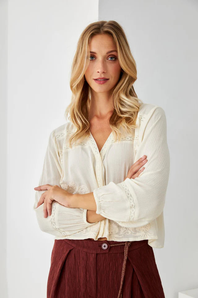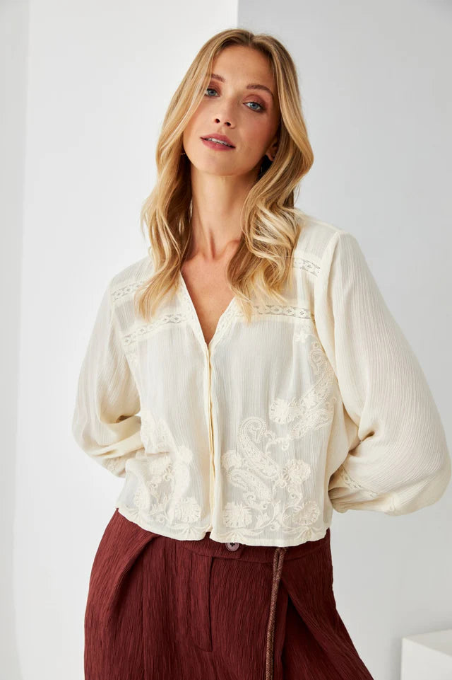 Questa camicetta a maniche lunghe si distingue per il suo tessuto con texture che conferisce una sensazione e un aspetto sofisticati. Presenta una chiusura con bottoni nascosta che offre una finitura pulita ed elegante, mentre il suo colletto alla coreana a forma di V aggiunge un tocco moderno e distintivo. I dettagli ricamati con nastri traforati e motivi paisley valorizzano il suo design artigianale, conferendo un carattere unico. I polsini elastici garantiscono comfort e una vestibilità perfetta per un uso quotidiano senza complicazioni. Ideale da abbinare in look formali o casual con stile.