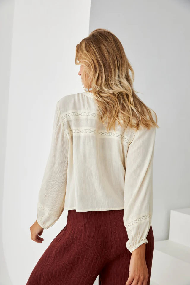 Esta blusa de manga larga destaca por su tejido con textura que aporta un tacto y apariencia sofisticados. Cuenta con una botonadura oculta que ofrece un acabado limpio y elegante, mientras que su cuello mao en forma de V añade un toque moderno y distintivo. Los detalles bordados con cintas caladas y motivos paisley realzan su diseño artesanal, aportando un carácter único. Los puños elásticos garantizan comodidad y ajuste perfecto para un uso diario sin complicaciones. Ideal para combinar en looks formales o casuales con estilo.
