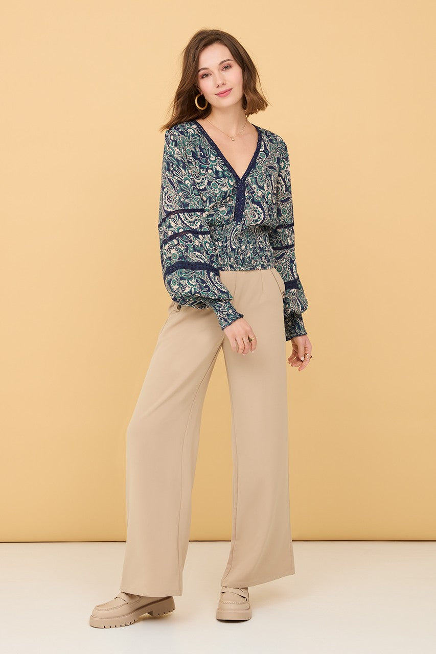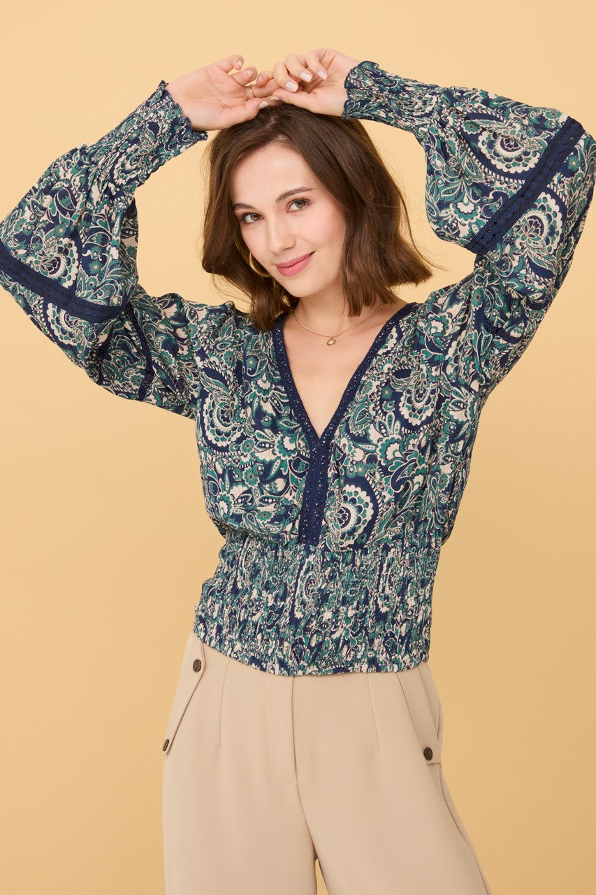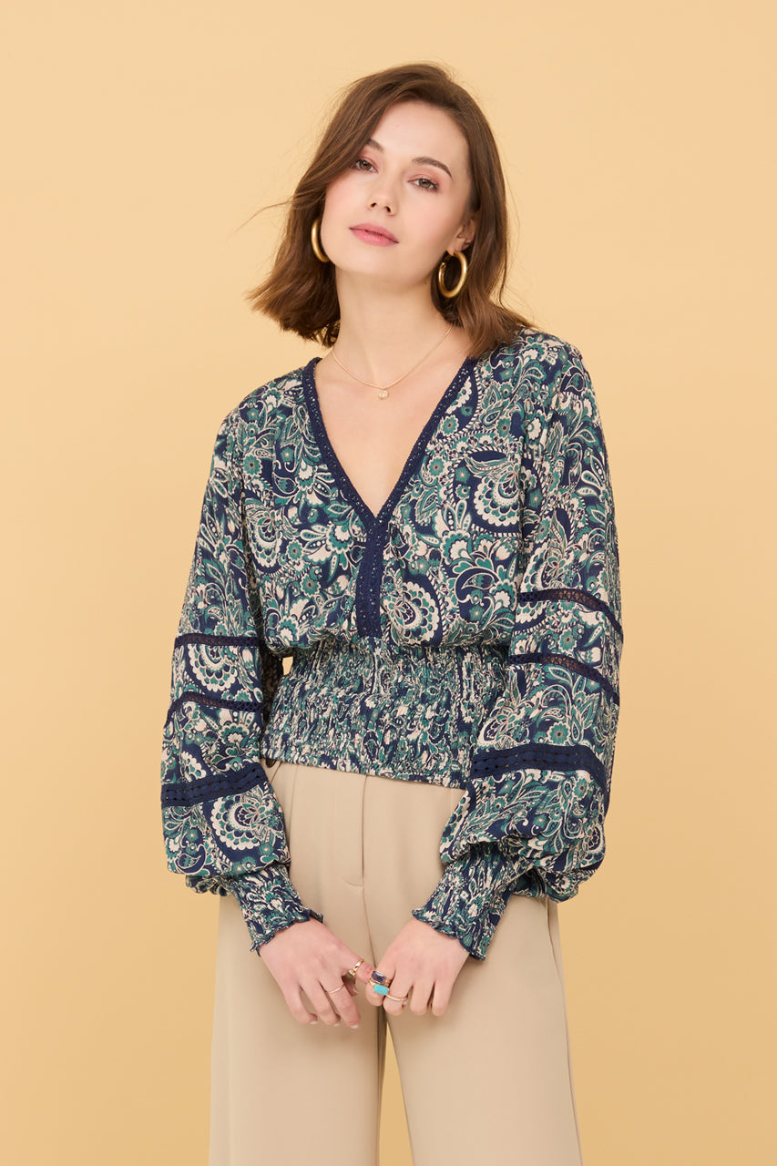 Blusa con maniche lunghe a sbuffo, con scollo a V, vita a nido d'ape, profili e parte centrale in blu navy