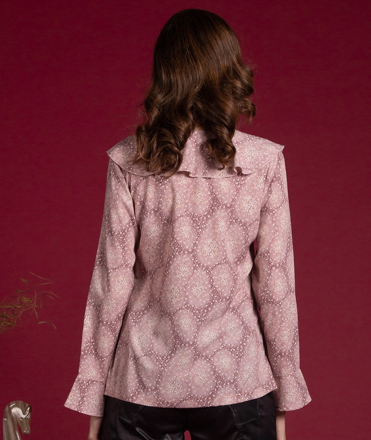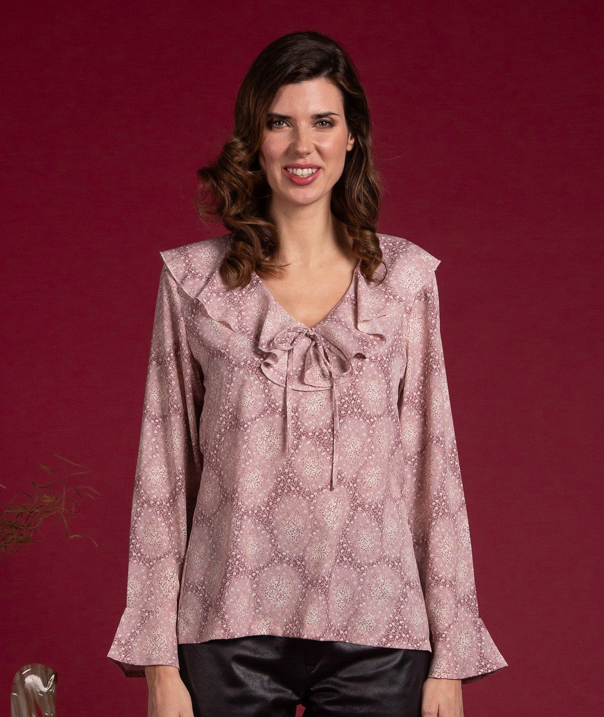 Blusa stampata rosa, con scollo a V con volant e fiocco, maniche lunghe