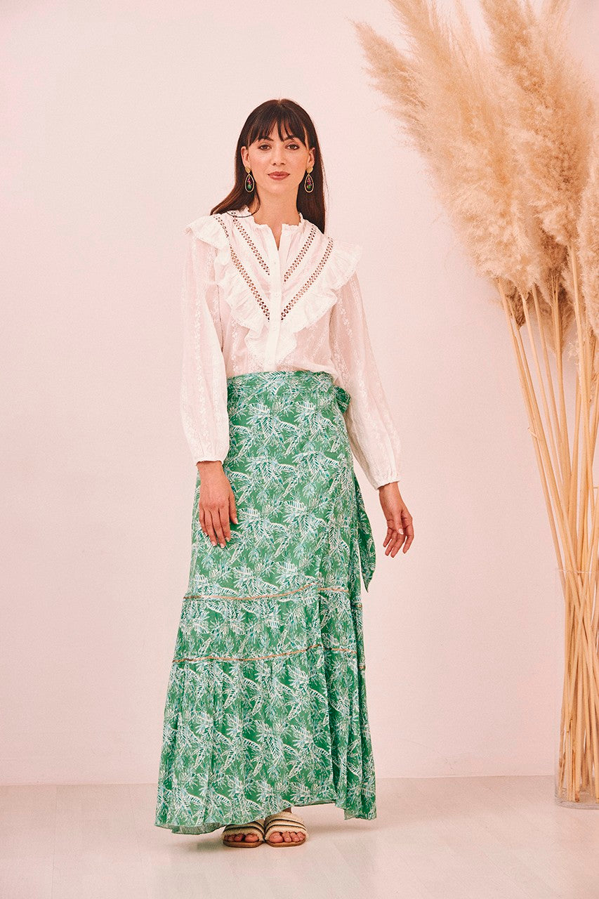 Scopri l'eleganza e il comfort con la nostra BLUSA VOLANTIS. Realizzata in morbido cotone, il suo design a manica lunga e il taglio fino ai fianchi ti donano una silhouette favorevole. Il giogo con volant e il collo alla coreana aggiungono un tocco femminile, mentre le maniche con volume e l'elastico ai polsini ti offrono versatilità e stile. Procuratela ora!