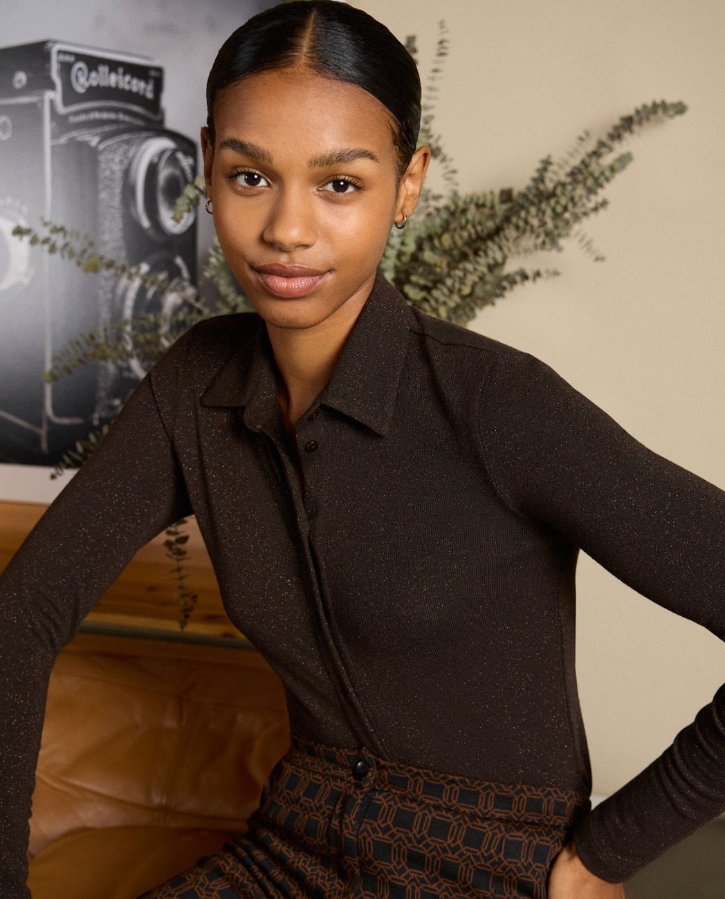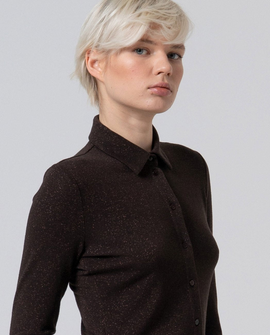 Questa camicia color cioccolato si distingue per il suo elegante filo di lurex, che dona un sottile splendore e sofisticatezza al tessuto. Perfetta per le occasioni in cui cerchi un tocco di distinzione senza rinunciare al comfort, il suo design combina uno stile contemporaneo con dettagli che valorizzano ogni look. Ideale per chi apprezza capi con una finitura curata e un tocco esclusivo.