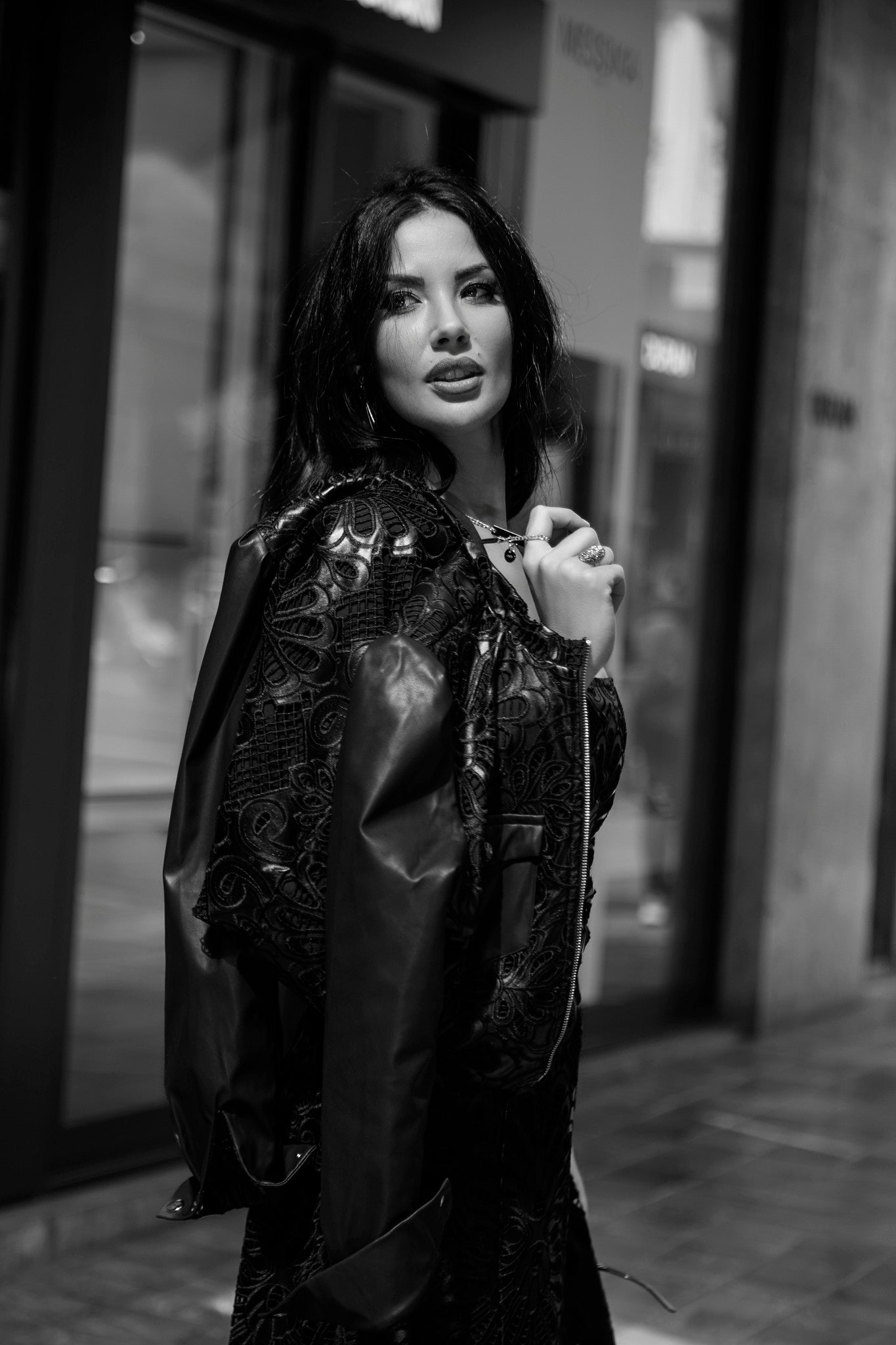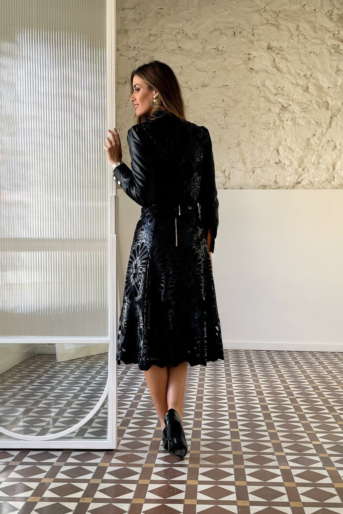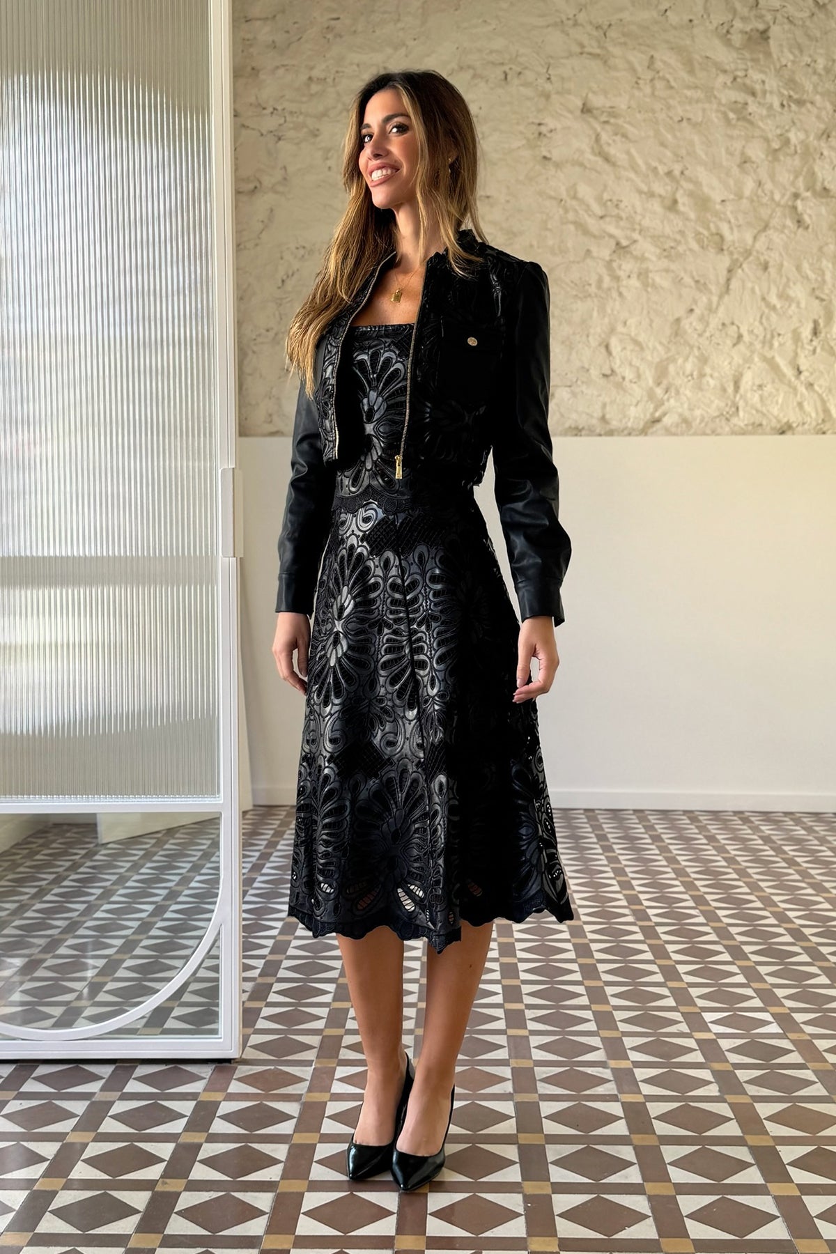 Questa giacca corta in ecopelle nera combina stile e comfort. Presenta maniche lunghe e collo alla coreana per un tocco moderno, mentre i dettagli in pizzo guipure sul davanti e sul retro aggiungono un tocco femminile ed elegante. Dispone di due pratiche tasche frontali e di una chiusura centrale con zip dorata. La sua composizione in poliestere e poliuretano garantisce durata e facile manutenzione. Perfetta per completare qualsiasi look con un'aria contemporanea e distintiva.
