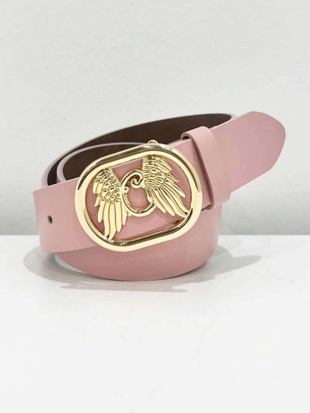 Cintura versatile in tonalità rosa. Progettata con fibbia dorata con logo che aggiunge un tocco di sofisticazione a qualsiasi look. La sua costruzione resistente e la finitura premium la rendono un pezzo essenziale per il guardaroba moderno. Perfetta per elevare sia outfit casual che più elaborati con un dettaglio di lusso accessibile.