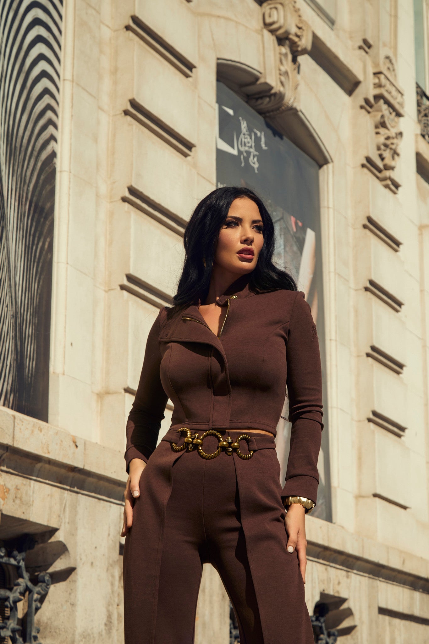 Questo completo due pezzi in tonalità marrone unisce eleganza e comfort. La giacca a collo alto con bottone dorato e manica lunga si chiude con una zip, offrendo un finish sofisticato e pratico. Il pantalone palazzo si distingue per la cintura color rame in vita e le balze su ogni gamba, con una zip invisibile laterale per una vestibilità perfetta. Realizzato in 93% viscosa e 7% elastan, offre una sensazione morbida e adattabilità per un uso prolungato. Ideale per occasioni formali con un tocco contemporaneo.