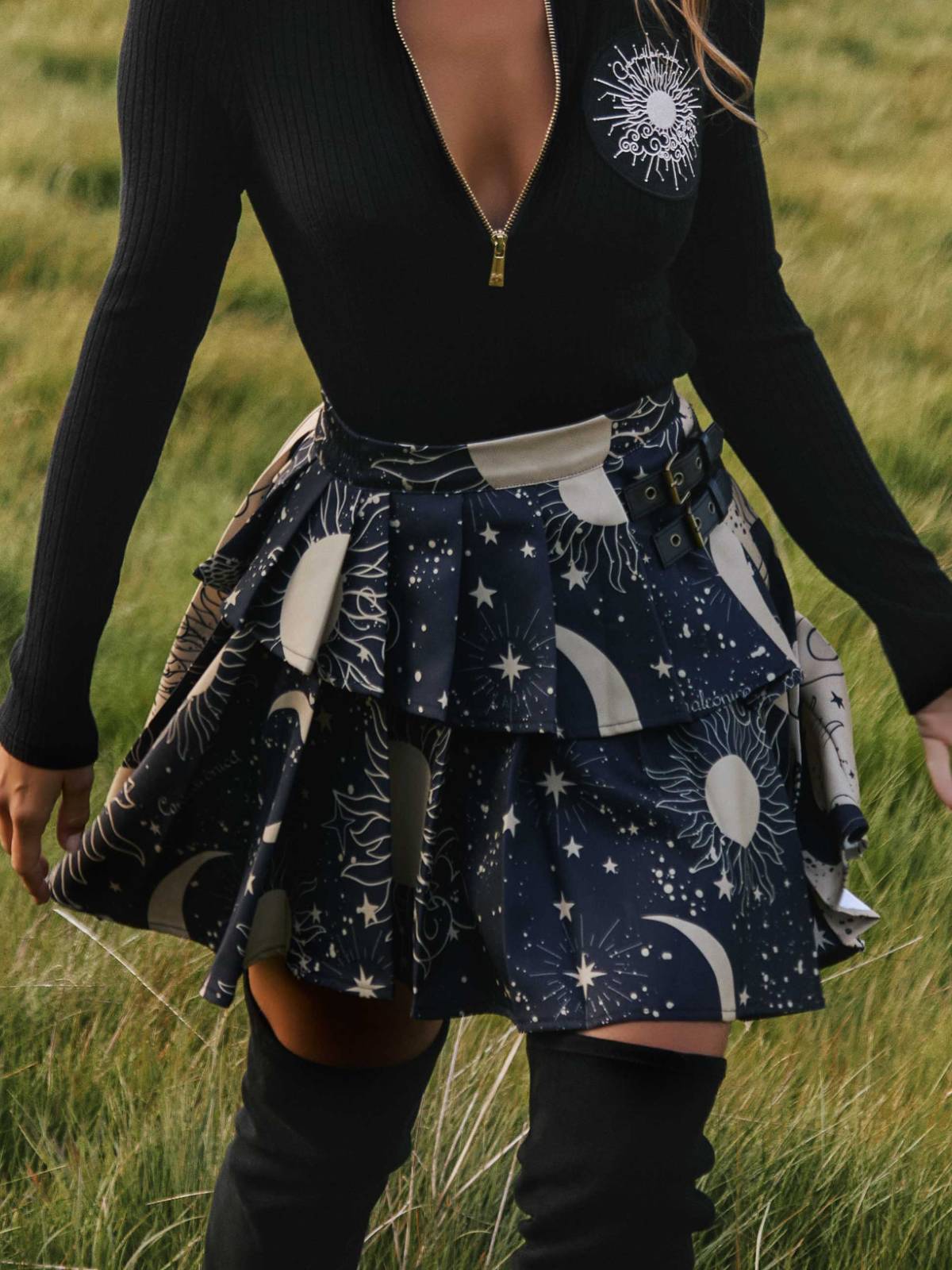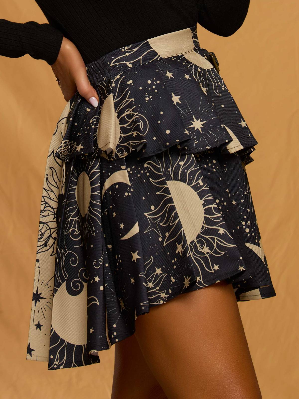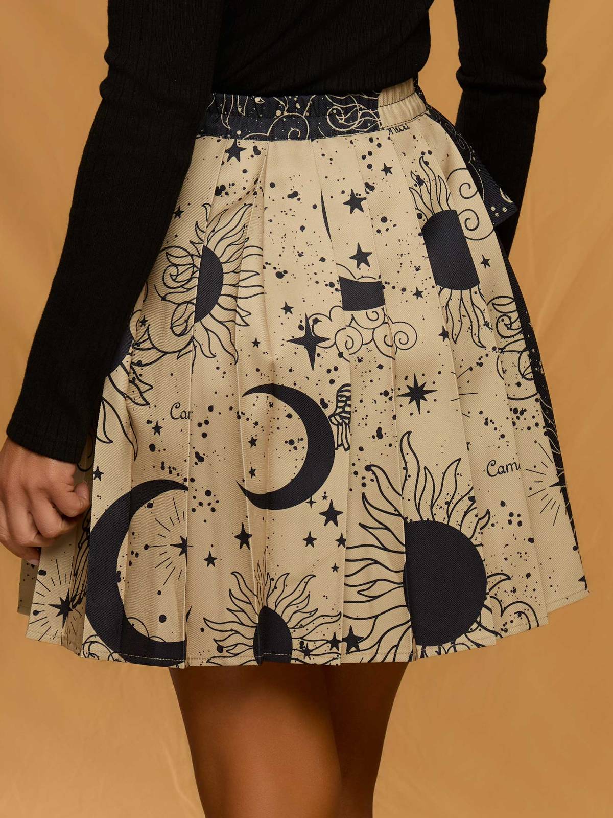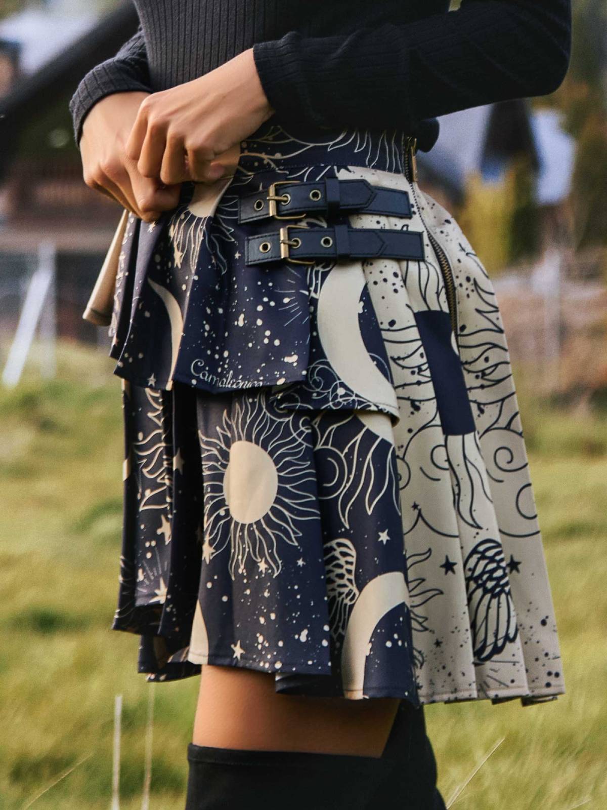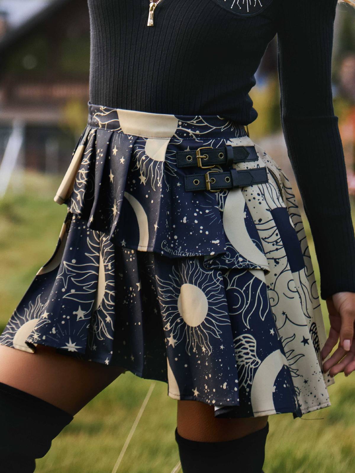 Gonna corta con orlo asimmetrico, con stampa personalizzata e vita alta. La gonna è decorata su un lato con due strisce di ecopelle nera che simulano cinture con fibbia dorata. Si chiude lateralmente con una cerniera dorata.
