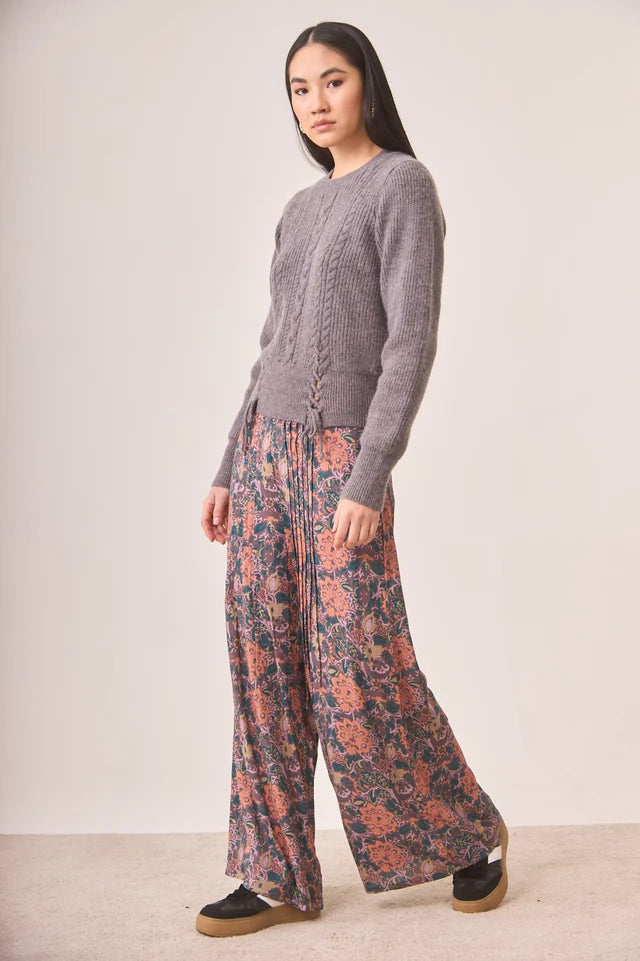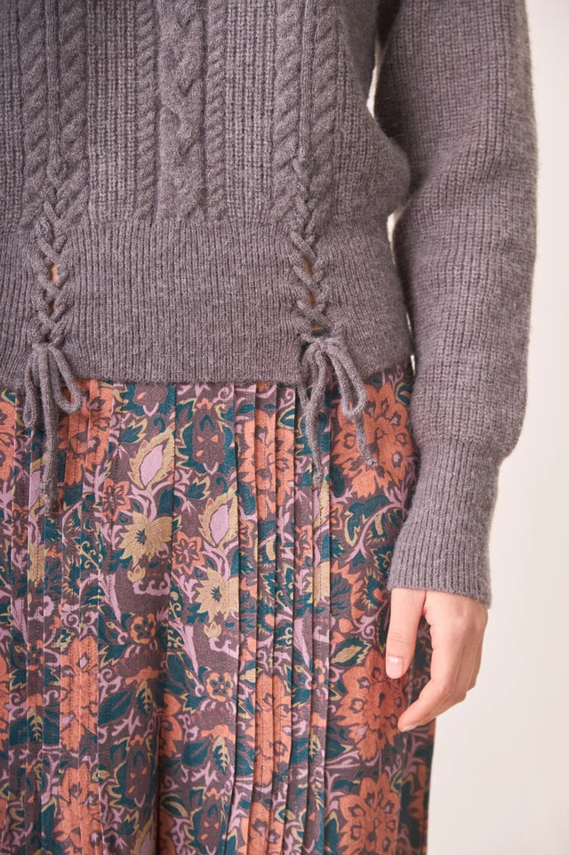 Este jersey de punto trenzado combina textura y estilo, con un cuello redondo que aporta un ajuste clásico y cómodo. Sus aberturas laterales con detalle de anudado corsetero realzan la silueta, ofreciendo un look sofisticado y moderno que se adapta fácilmente a diferentes estilos y ocasiones. Ideal para quienes buscan una prenda versátil que aporte personalidad a cualquier outfit.