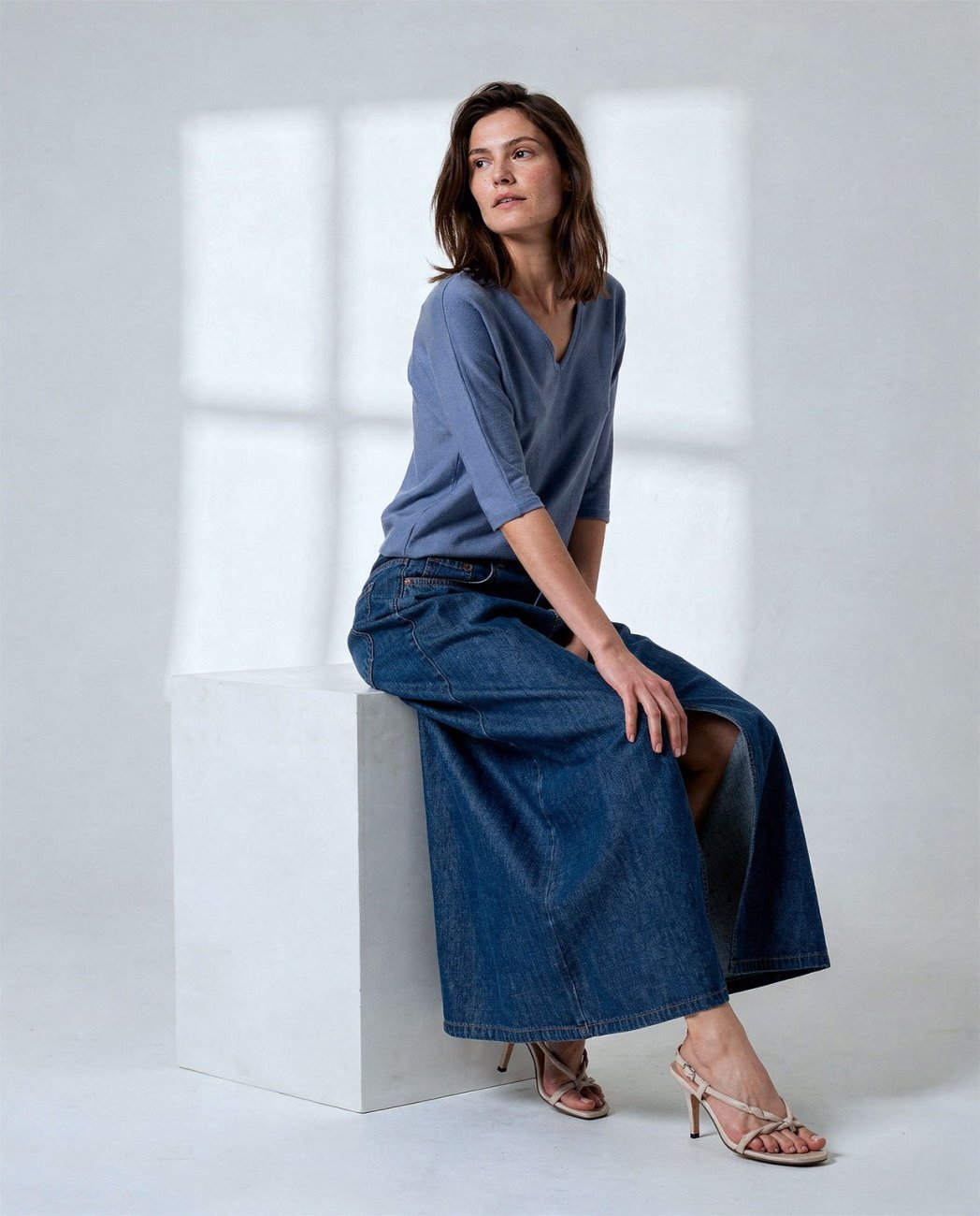 Scopri l’eleganza senza tempo della nostra Gonna Lunga Inca. Realizzata in denim blu chiaro con una cura miscela di cotone e lyocell, questa gonna unisce comodità e stile. Il suo taglio dritto con orlo leggermente svasato crea una silhouette fluida e valorizzante, mentre la cintura fissa a vita media garantisce una vestibilità sicura. Lo spacco frontale aggiunge un tocco di raffinatezza e movimento. Perfetta per creare abbinamenti versatili, dal casual al più ricercato.