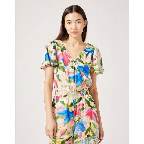 Tuta lunga con maniche corte, scollo a V incrociato, stampa floreale, vita gommata