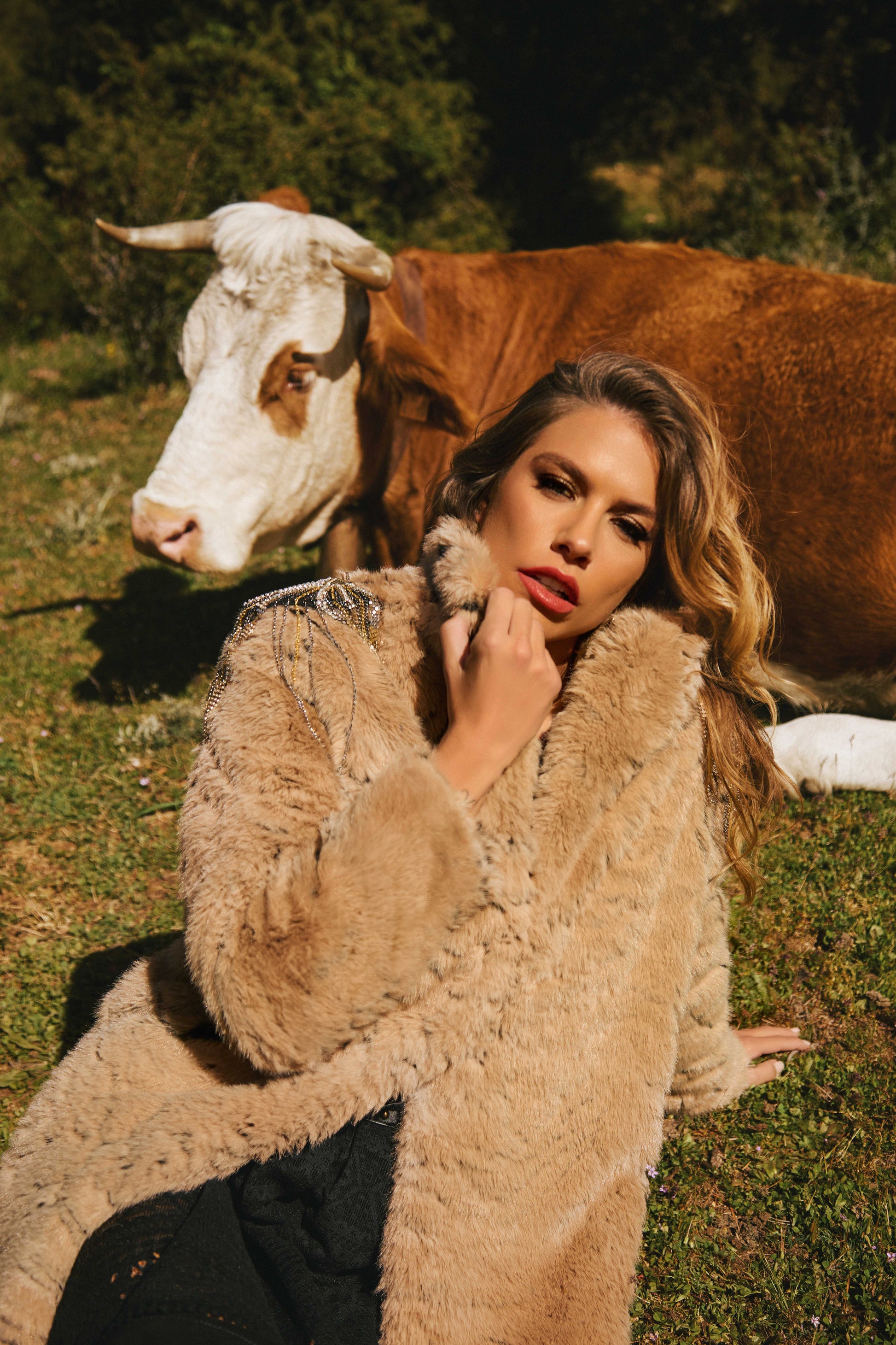 Cappotto in pelliccia, collo alto e chiusura con bottoni centrali. Sulle spalline presenta dettagli di spalline in metallo.
