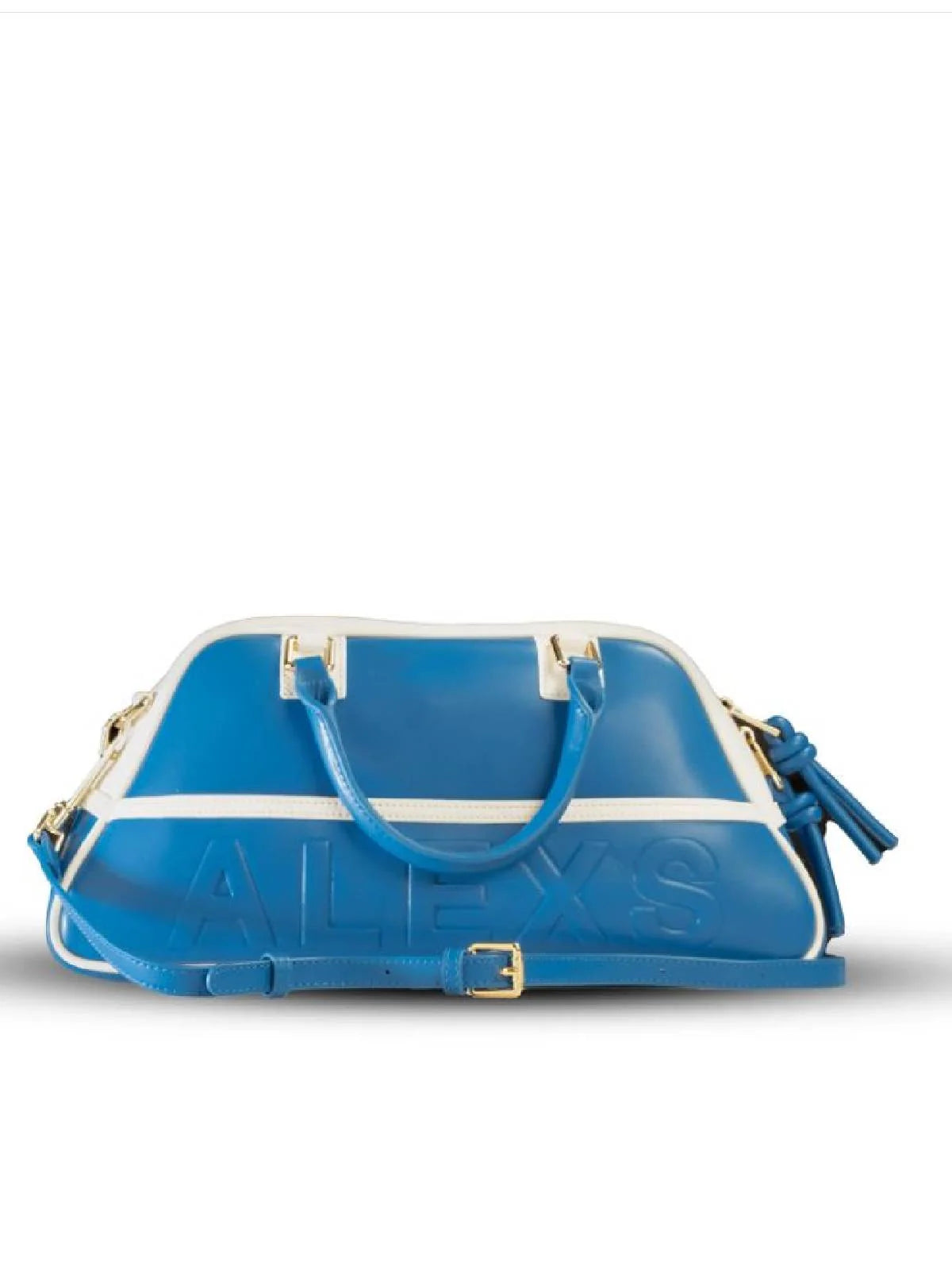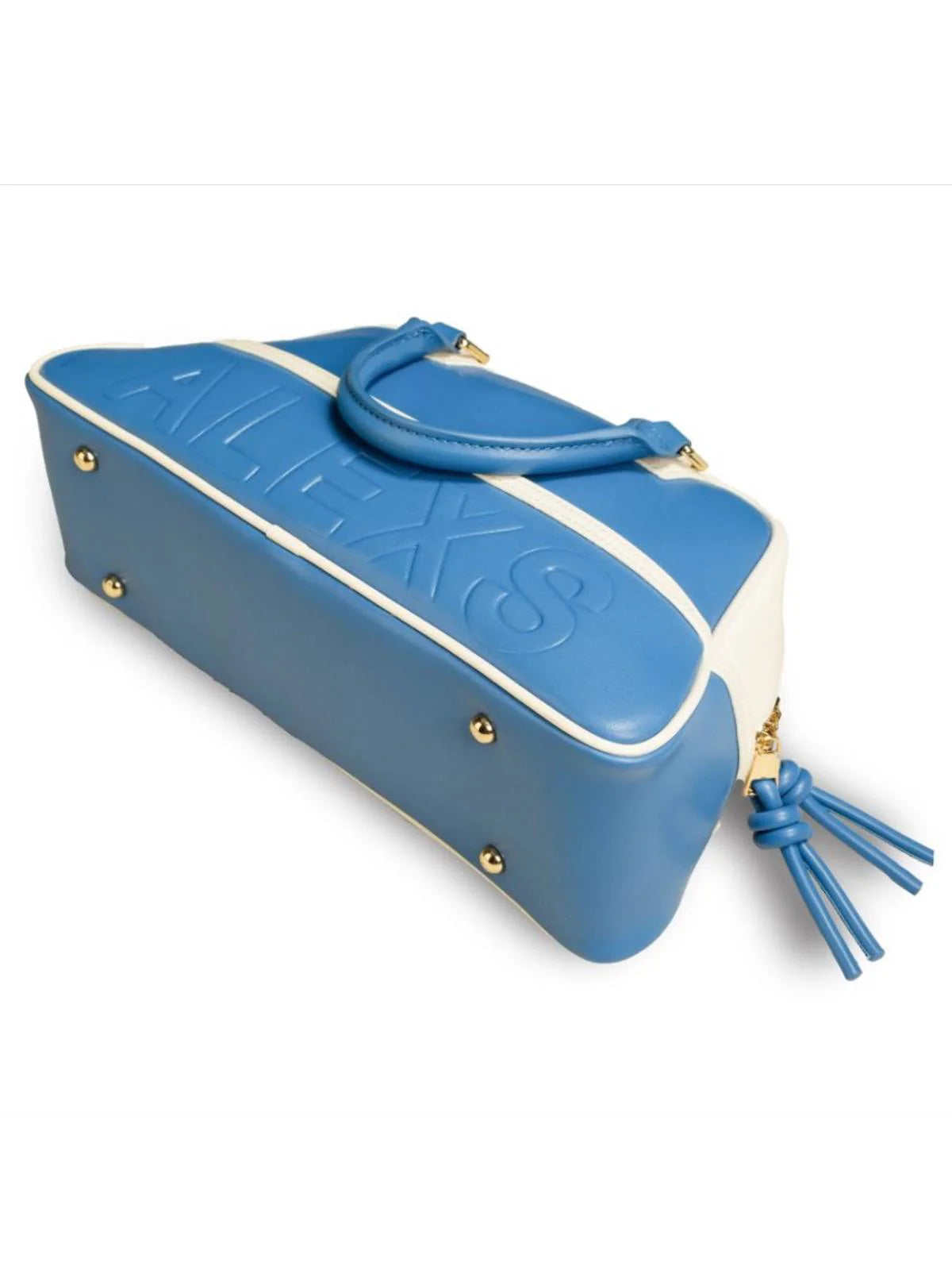 Bolso Deportivo Azul, con doble asa y bandolera para mayor comodidad. Fabricado en piel de alta calidad, cuenta con amplio espacio interior y varios bolsillos para una organización perfecta. Personalizado con logo en relieve y detalles de piel blanca