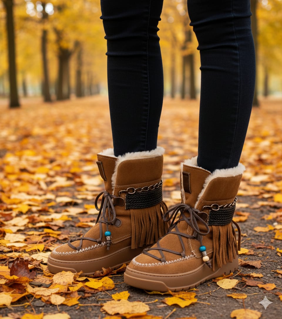 Este botín de color tabaco te sorprenderá con su comodidad y estilo. Con cordones por delante y flecos en la parte trasera, junto con una cadena, forro de pelo, este botín está hecho para impresionar. La suela de goma cosida y el tejido de piel garantizan su durabilidad y resistencia. ¡Una elección perfecta para cualquier ocasión!