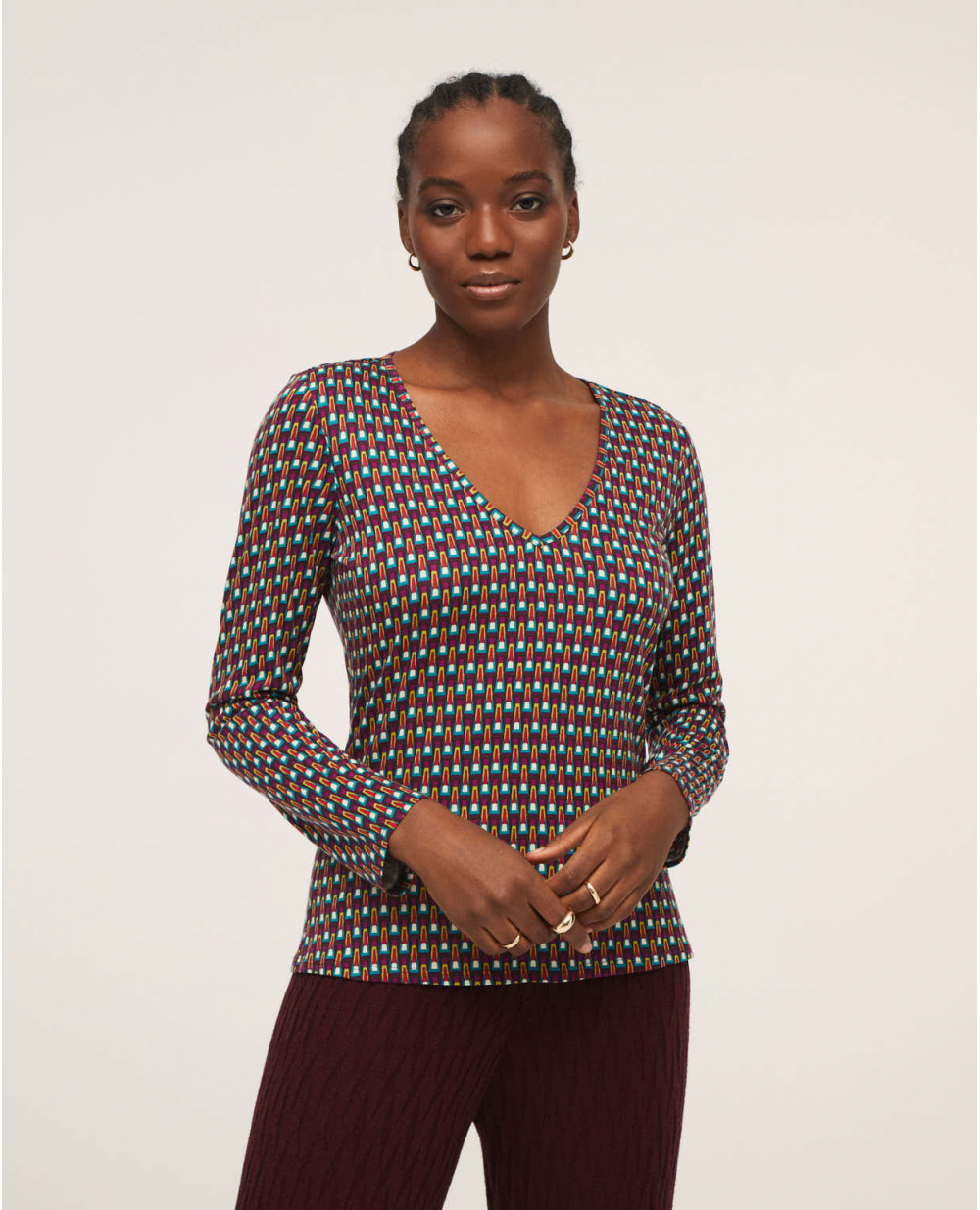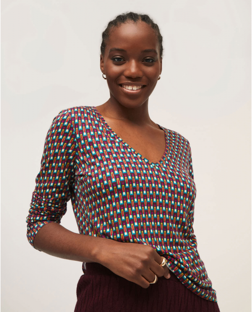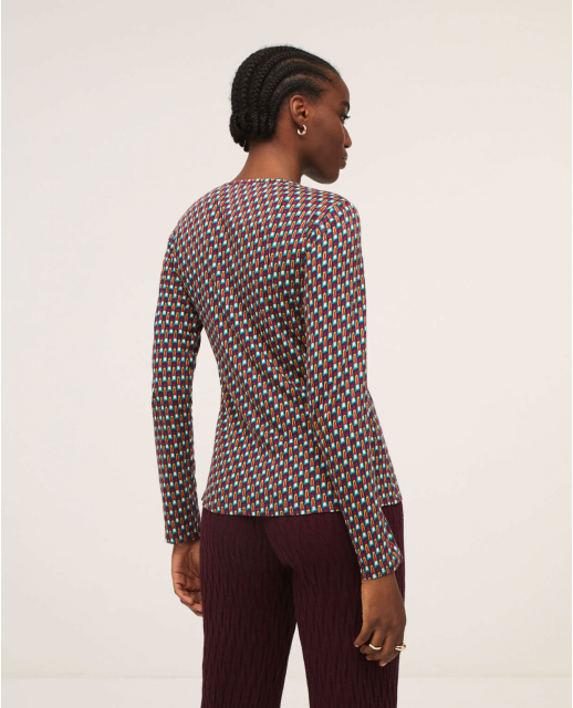 Camiseta con escote a pico y manga larga, estampado geometrico en colores