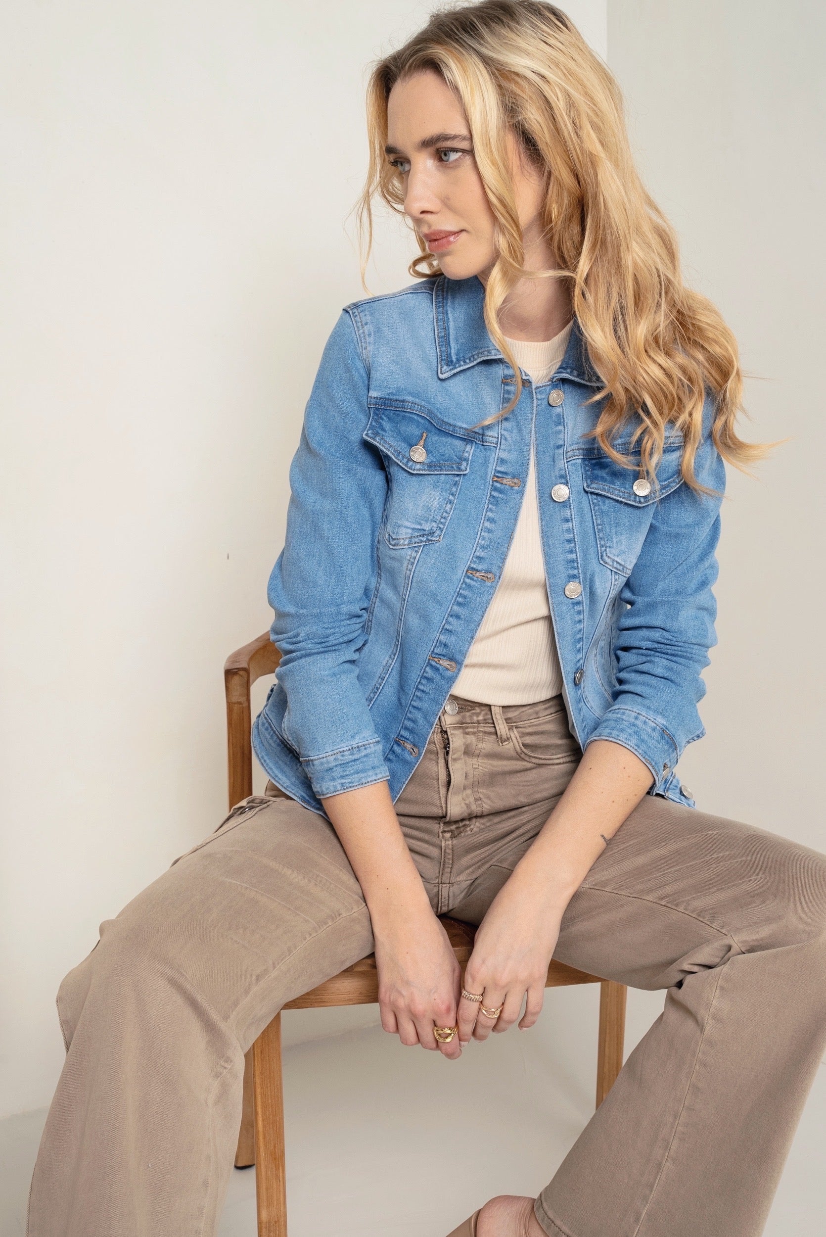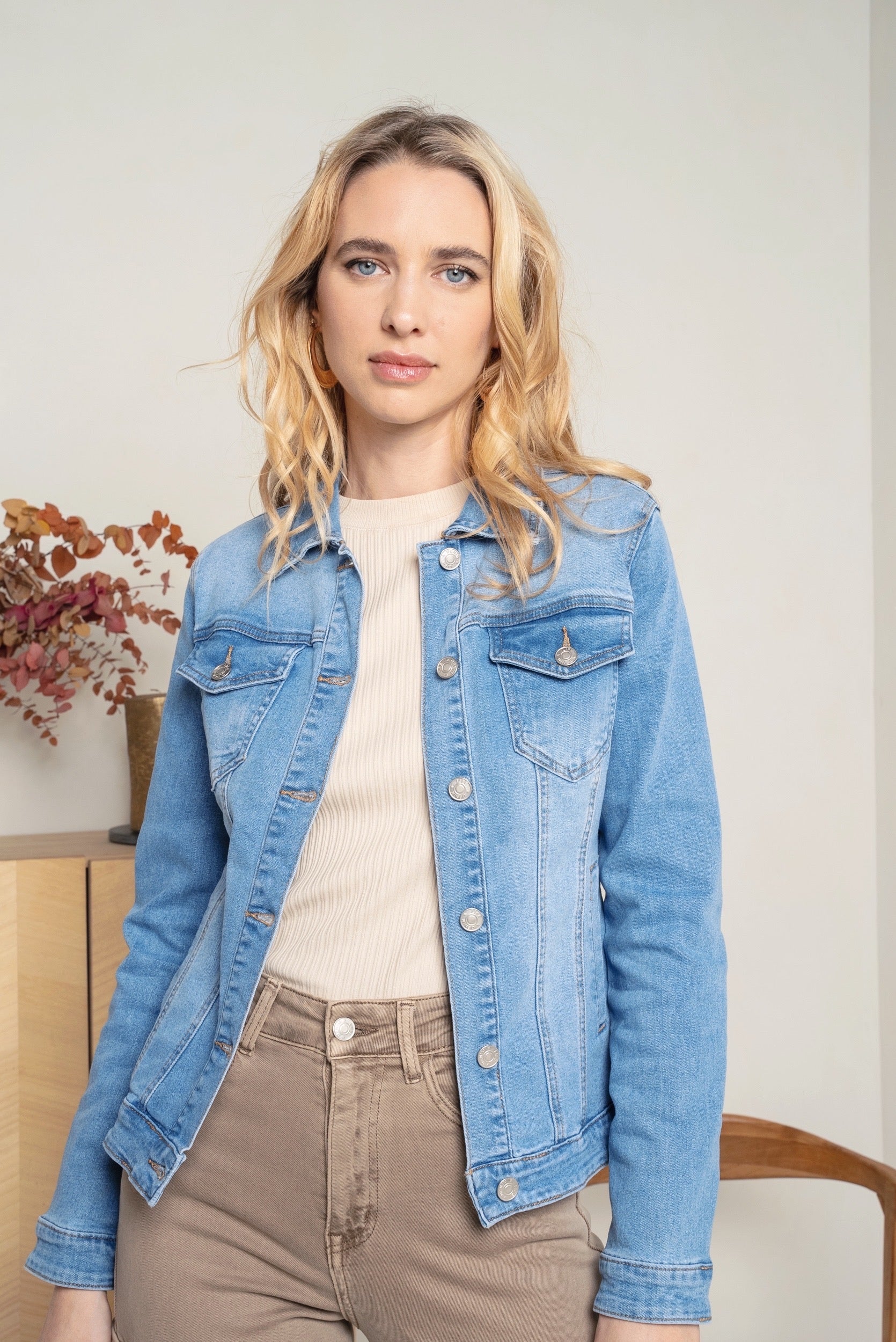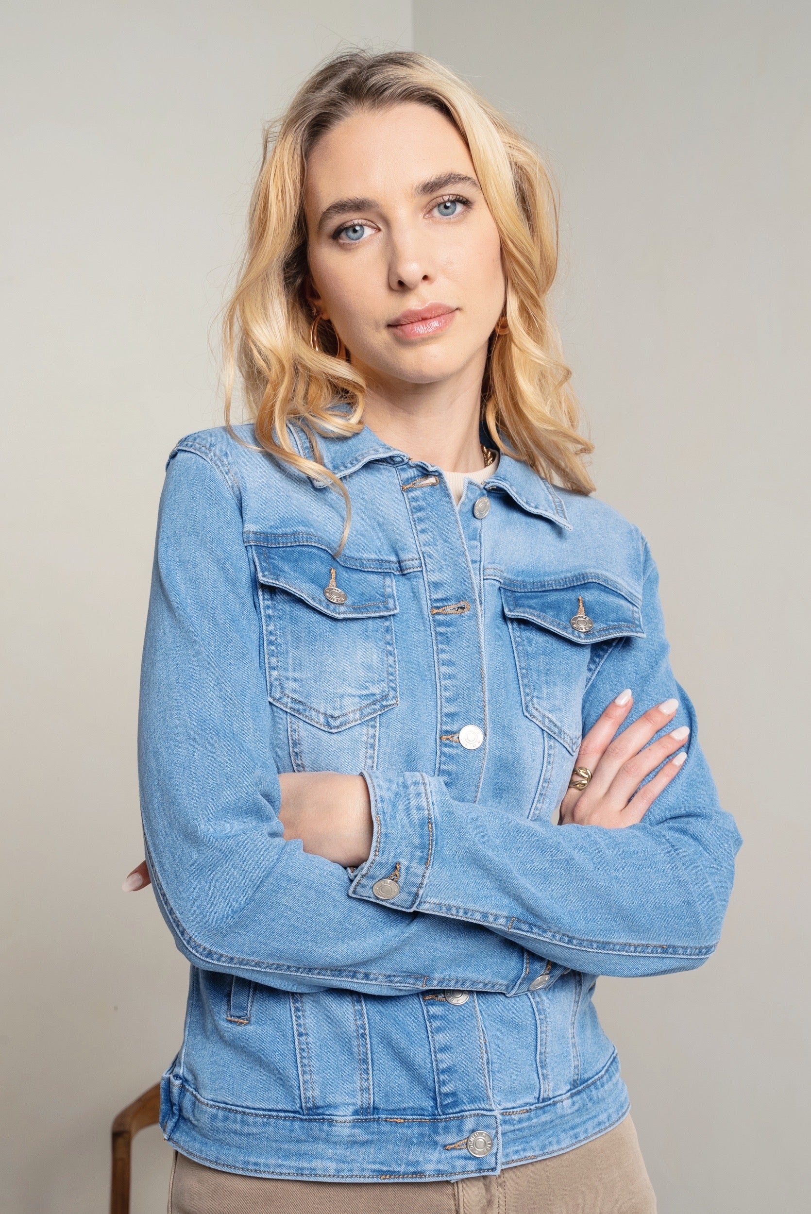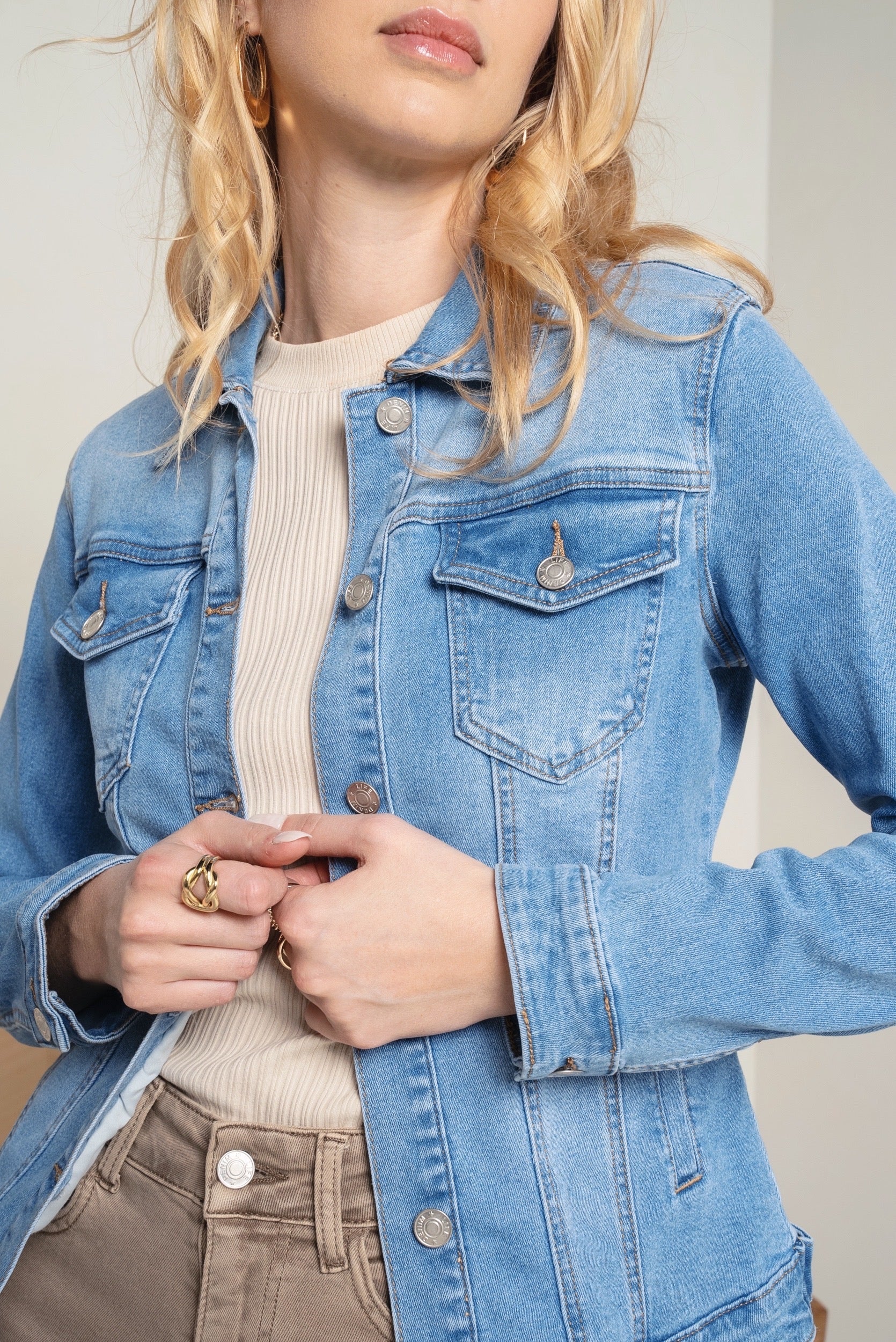 Cazadora vaquera, color azul claro, con estampación en la espalda de mariposa en lentejuelas y cristal